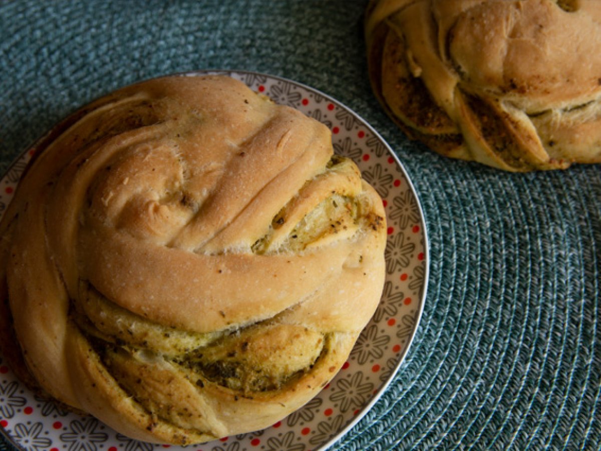 Painea impletita cu pesto este nu doar delicioasa, ci si o sursa de nutrienti, datorita ingredientelor precum faina, uleiul de masline si pesto, care aduc antioxidanti si grasimi sanatoase.