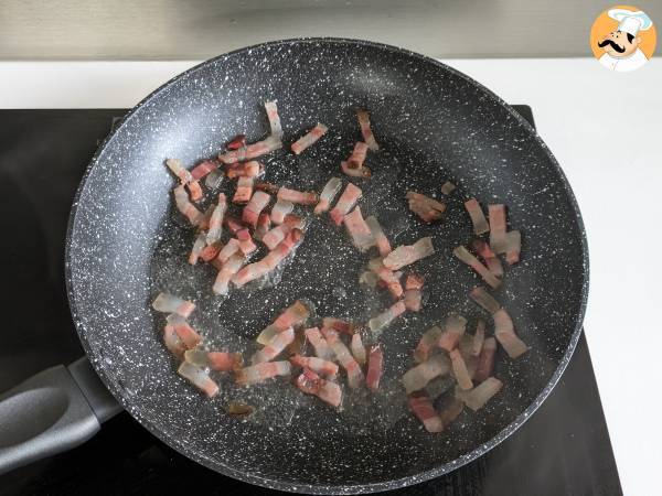 Puneți guanciale într-o tigaie fără grăsime și prăjiți la foc mic aproximativ 9 minute, amestecând des pentru a nu se arde.