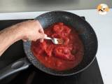 Turnați roșiile decojite în tigaia folosită la gătirea guanciale și adăugați un ardei iute întreg. Zdrobiți roșiile cu o furculiță și lăsați sosul de roșii la fiert aproximativ 12-13 minute, la foc mediu.