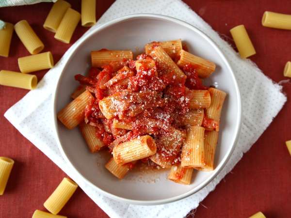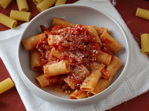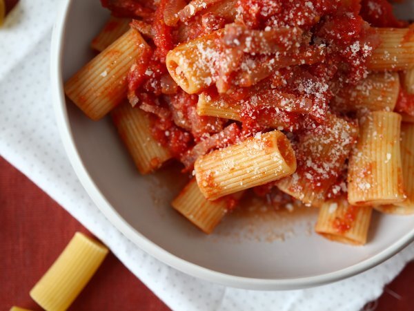 Rețeta tradițională de amatriciana folosește guanciale, dar poți folosi pancetta dacă vrei.