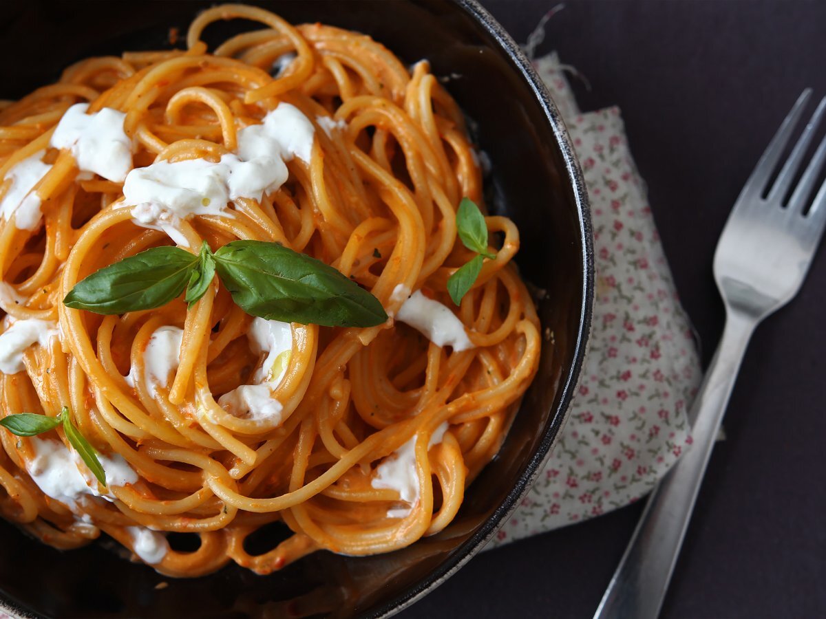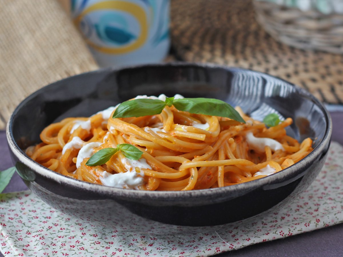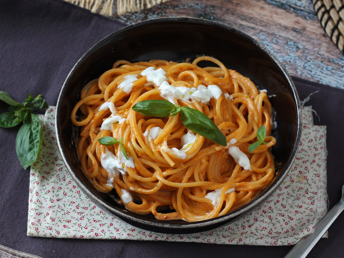 Un prim fel delicios! Paste cremoase cu brânză burrata și roșii cherry este rețeta pe care o aveți mereu la îndemână pentru când aveți chef de ceva gustos fără a petrece mult timp în bucătărie. Se face un sos cu pomodorini, apoi se mixează cu burrata, parmezanul ras și câteva firișoare de busuioc: rezultă o cremă echilibrată care se îmbină perfect cu pastele. Noi am folosit spaghettoni, dar puteți alege și forme scurte. Urmați pașii rețetei dacă doriți să pregătiți un prim fel rapid și gustos, și scrieți în comentarii ce părere aveți despre pastele noastre cu burrata și roșii cherry..