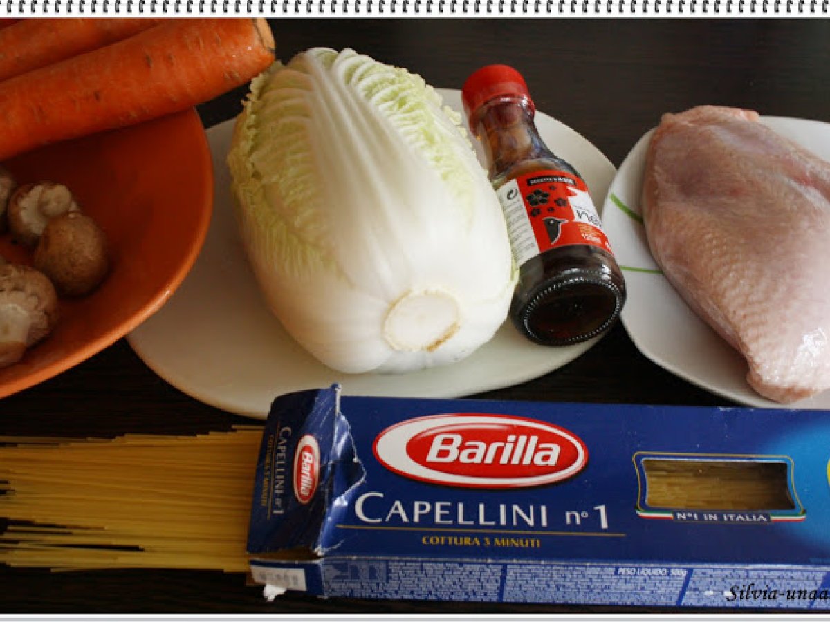 Paste cu legume si pui - in stil chinezesc PrecedentulUrmătorul Felul principalFoarte ușor40 min Trimite unui prieten Printează pagina Adresează o întrebare autorului Postează o poză cu rețeta gătită de tine Ingrediente 4 o mana de ciuperci morcovi o varza chinezeasca mica un piept de pui sos nems & sos soya ulei de susan (sau floarea soarelui) paste - preferabil de orez,
