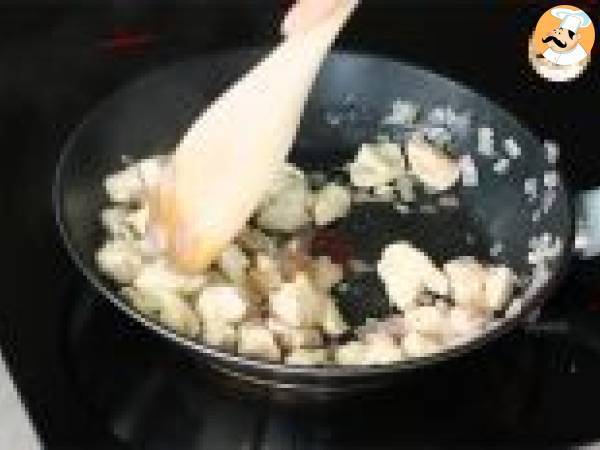 Se incalzeste uleiul de masline intr-o tigaie si se prajeste salota taiata si carnea de pui taiata cubulete.