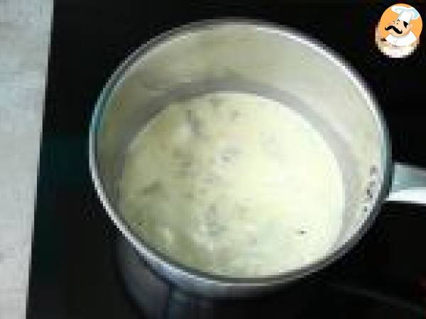 Intr-o cratita puneti smantana, gorgonzola, sare si piper. Se aduce la fierbere si se lasa la foc mic timp de aproximativ 10 minute, amestecand ocazional.