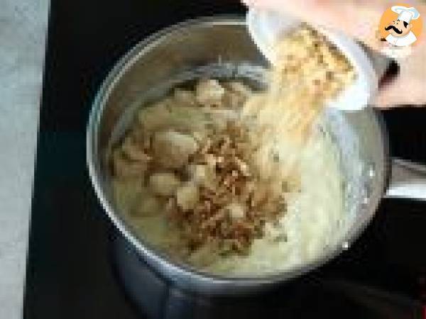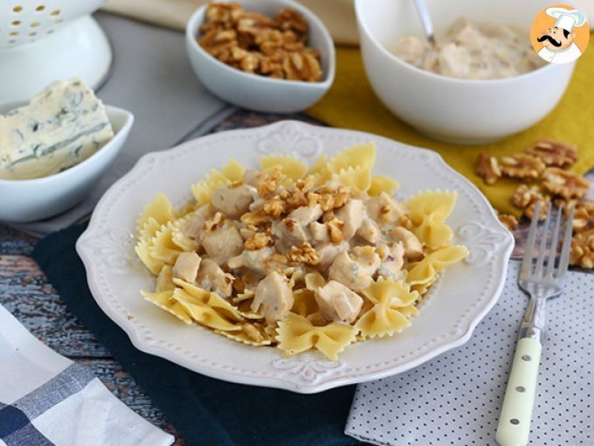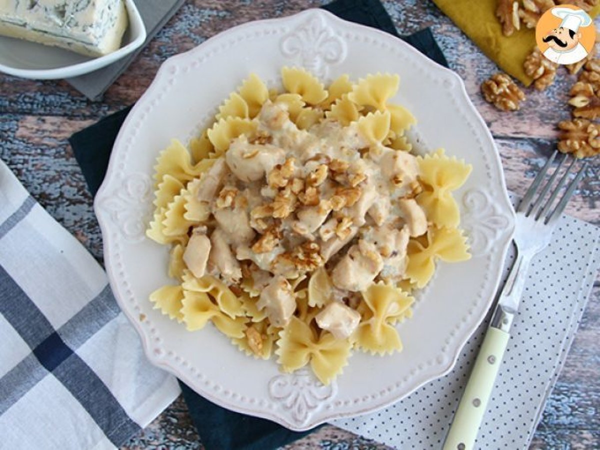 Dupa 10 minute, adaugati puiul si salota la sosul gorgonzola. De asemenea, adaugati nucile bine tocate, amestecati si luati de pe foc.