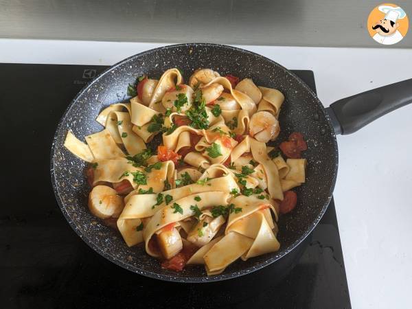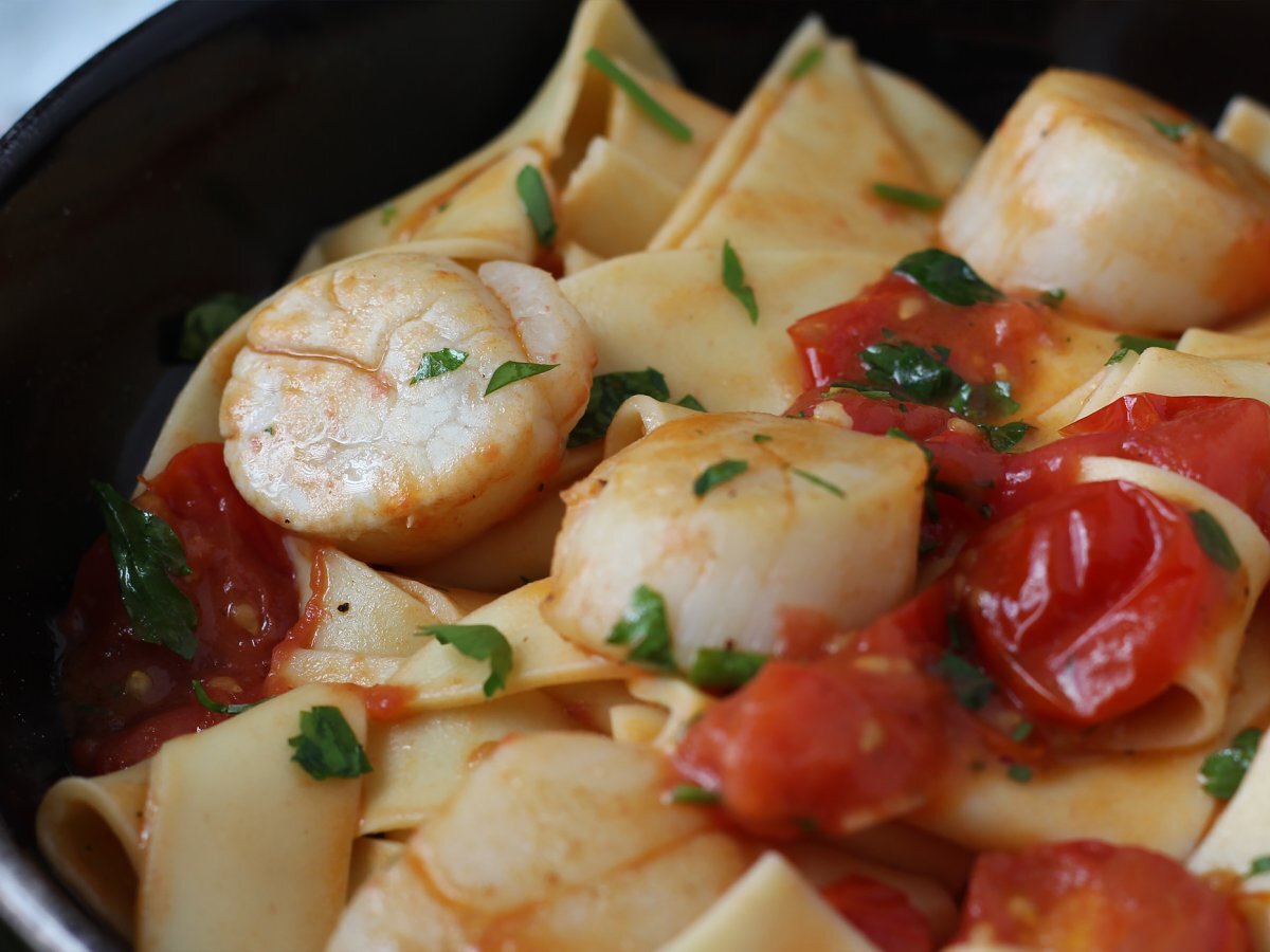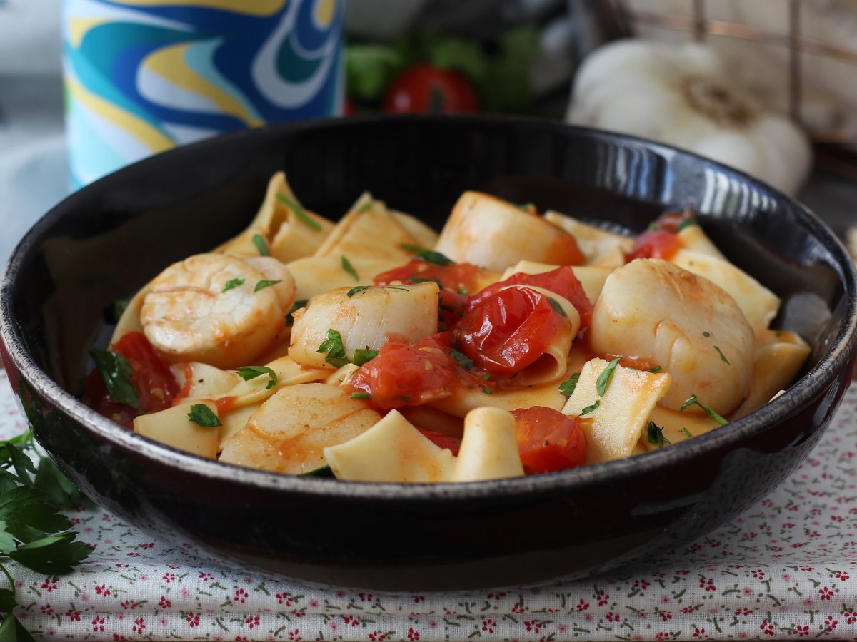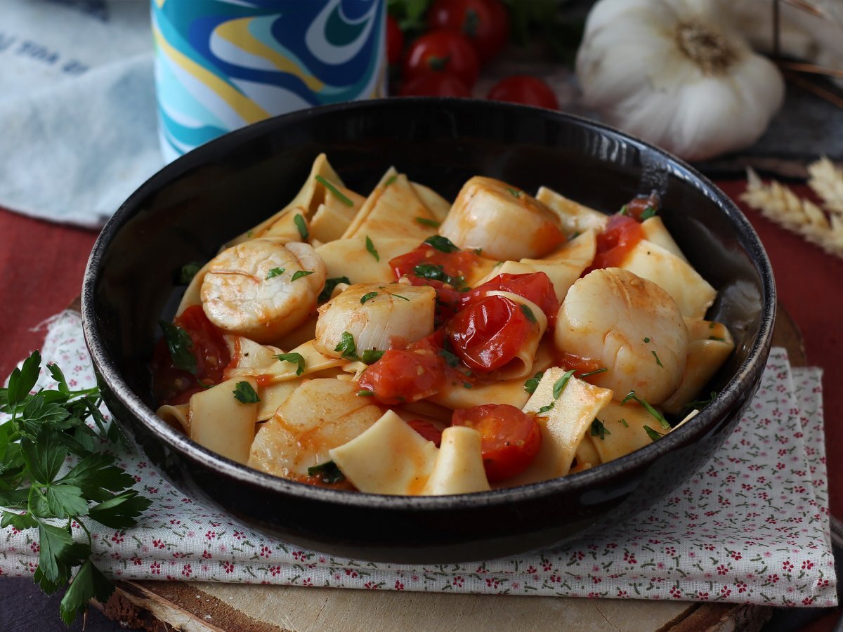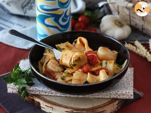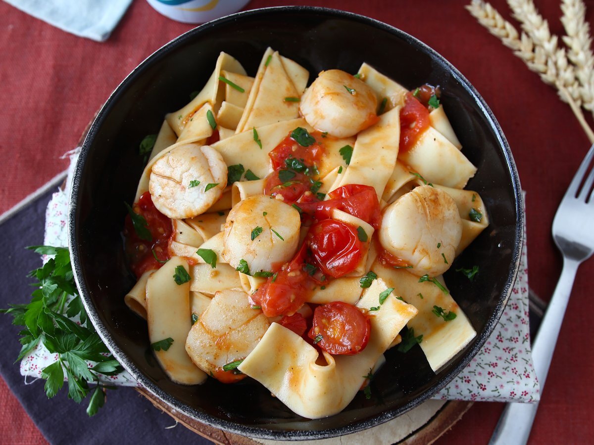 Ați cumpărat scoci Saint-Jacques și doriți să le folosiți pentru a pregăti un preparat delicios cu paste? Sunteți în locul potrivit! :-) Iată rețeta noastră de pappardelle cu scoici și roșii cherry. În această rețetă am pregătit paste de casă, dar dacă te grăbești, poți folosi pastele lungi preferate: spaghetti sau tagliatelle, de exemplu. Perfectă pentru o cina la lumina lumânărilor sau pentru a-ți impresiona invitații, această rețetă elegantă de „paste” nu va lăsa pe nimeni indiferent ;-)