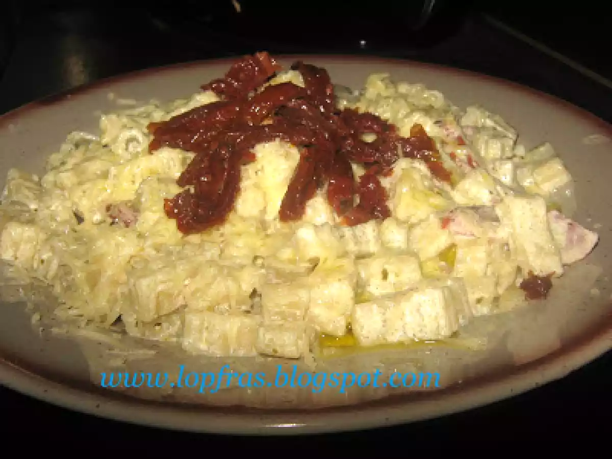 Paste cu smantana, sos pesto si mustar dijon PrecedentulUrmătorul Felul principalFoarte ușor45 min Trimite unui prieten Printează pagina Adresează o întrebare autorului Postează o poză cu rețeta gătită de tine Ingrediente 4 250 g paste mici 250 g smantana 3 lingurite sos pesto 2 lingurite mustar sarat dijon 2 linguri ulei de masline pentru sos si una pentru ornat 100 gr pastrama de porc 100 gr emmentaler sau orice branza care se topeste usor nucsoara macinata rosii uscate pentru ornat