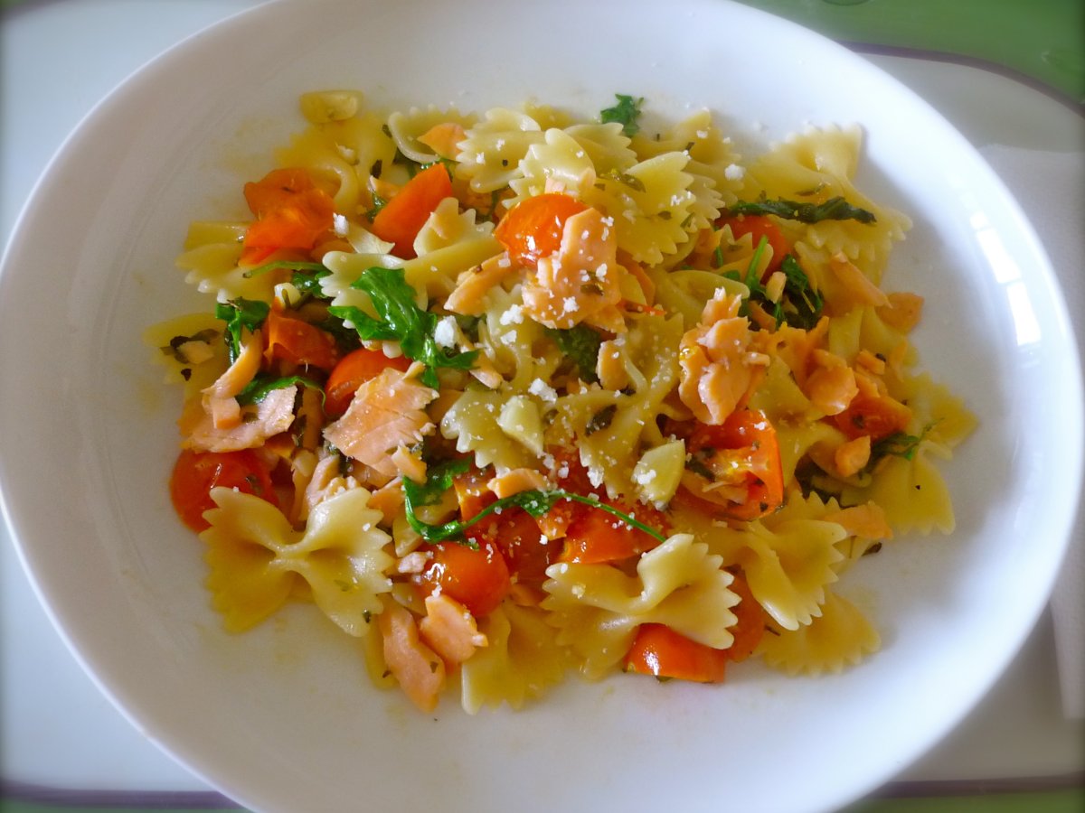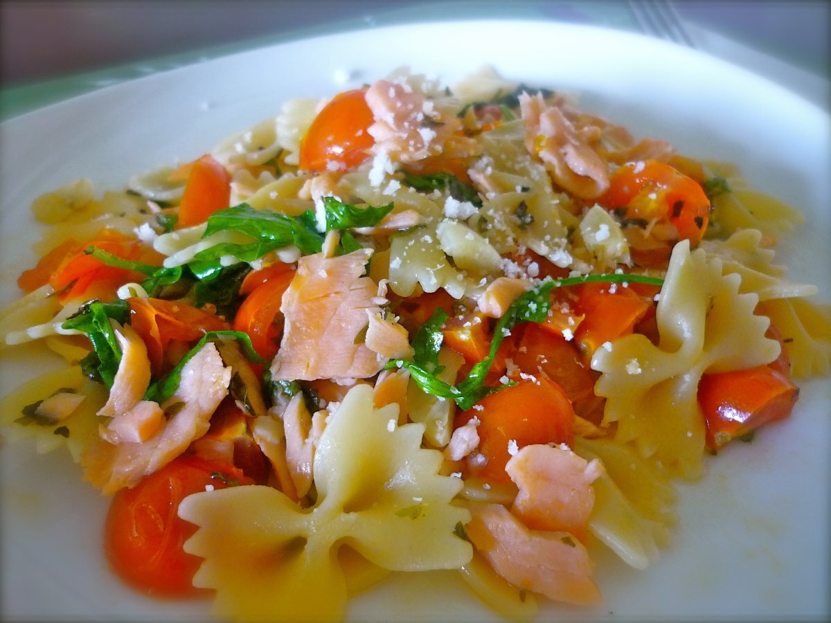 Paste cu somon afumat si rucola PrecedentulUrmătorul Felul principalFoarte ușor22 min Trimite unui prieten Printează pagina Adresează o întrebare autorului Postează o poză cu rețeta gătită de tine Un preparat delicios si rapid pentru iubitorii de paste. Ingrediente 2 200 g paste 200 g somon afumat 4 căței de usturoi 10 roșii cherry o mână de frunze de rucola 100 ml vin alb sec oregano 1 lingură ulei de măsline piper negru sare pentru apa în care fierb pastele