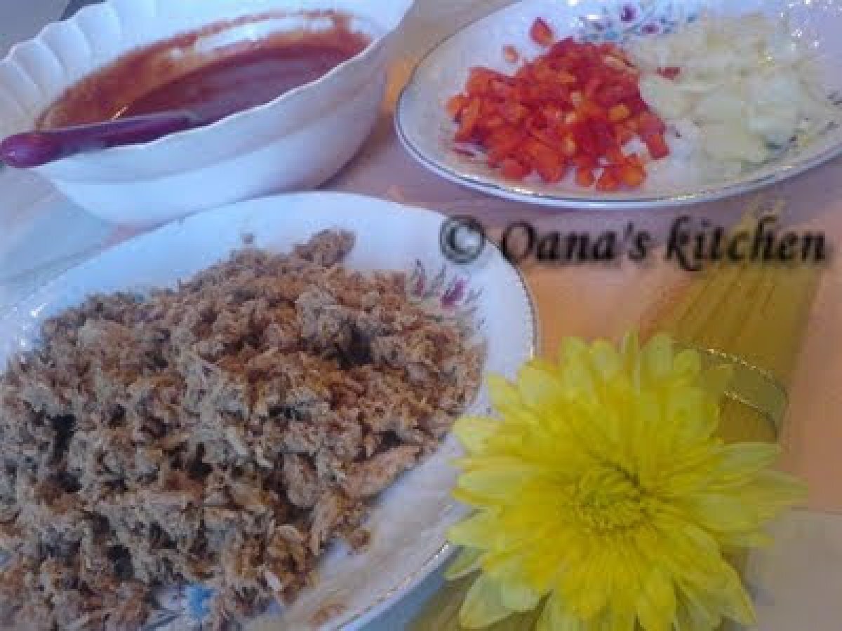 Paste cu ton PrecedentulUrmătorul Felul principalFoarte ușor28 min Trimite unui prieten Printează pagina Adresează o întrebare autorului Postează o poză cu rețeta gătită de tine Ingrediente 2 spaghete ton maruntit suc de rosii ceapa ardei boia de ardei iute sare piper ulei de masline