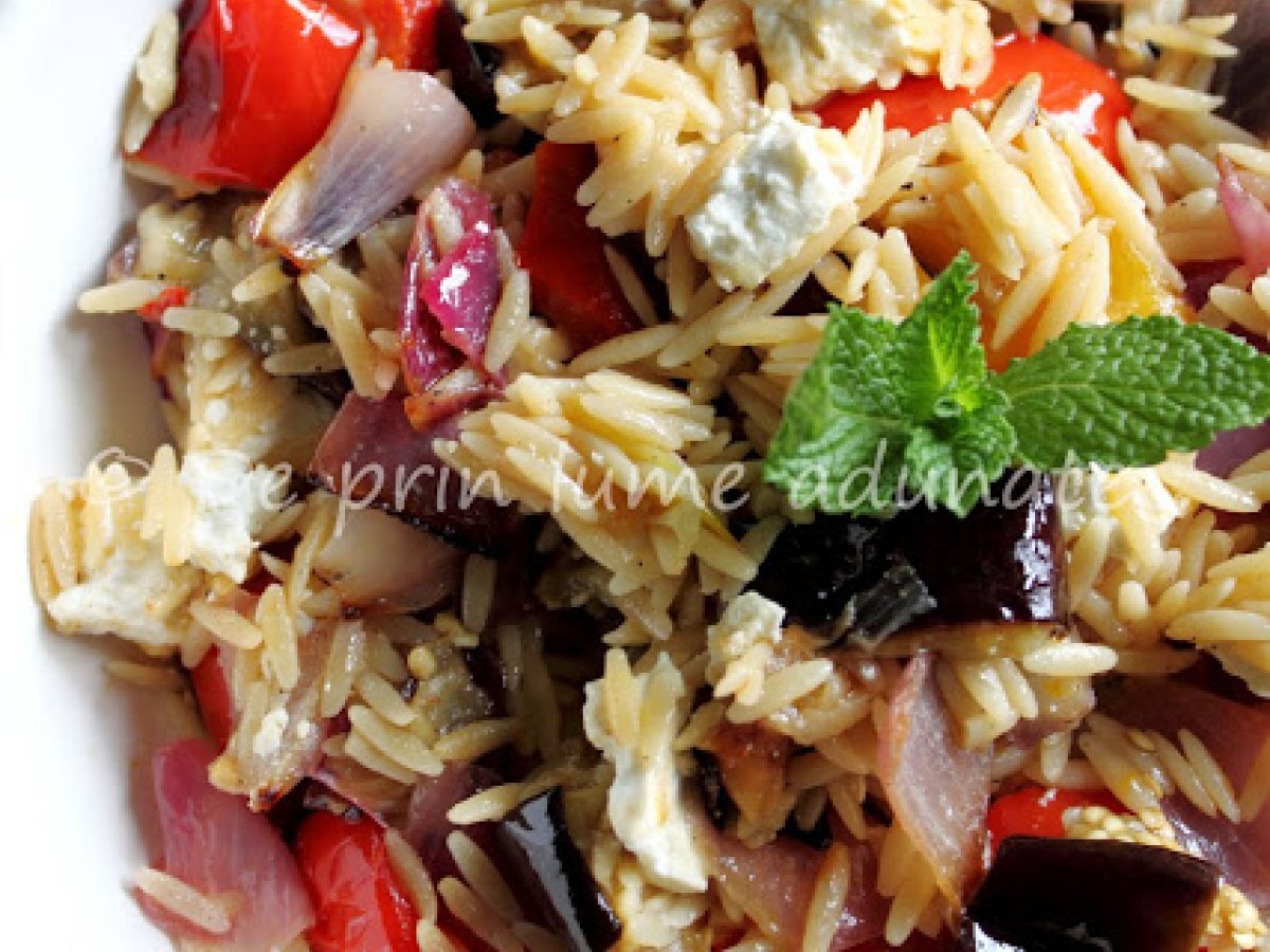 Paste orzo cu legume la cuptor Felul principalFoarte ușor40 min Trimite unui prieten Printează pagina Adresează o întrebare autorului Postează o poză cu rețeta gătită de tine Ingrediente 4 1 cana de paste 1 vanata medie taiata bucati mari 1 ceapa rosie mare taiata bucati mari 1 ardei gras rosu taiat bucati mari 1 ardei gras galben taiat bucati mari 2 catei de usturoi feliati 1/3 cup (80 ml) ulei de masline 1 lingurita sare piper dupa gust Pentru dressing: 1/3 cup (80 ml) ulei de masline 1/3 cup (80 ml) zeama de lamaie 1 lingurita de sare piper dupa gust 1/2 lingurita chimen macinat