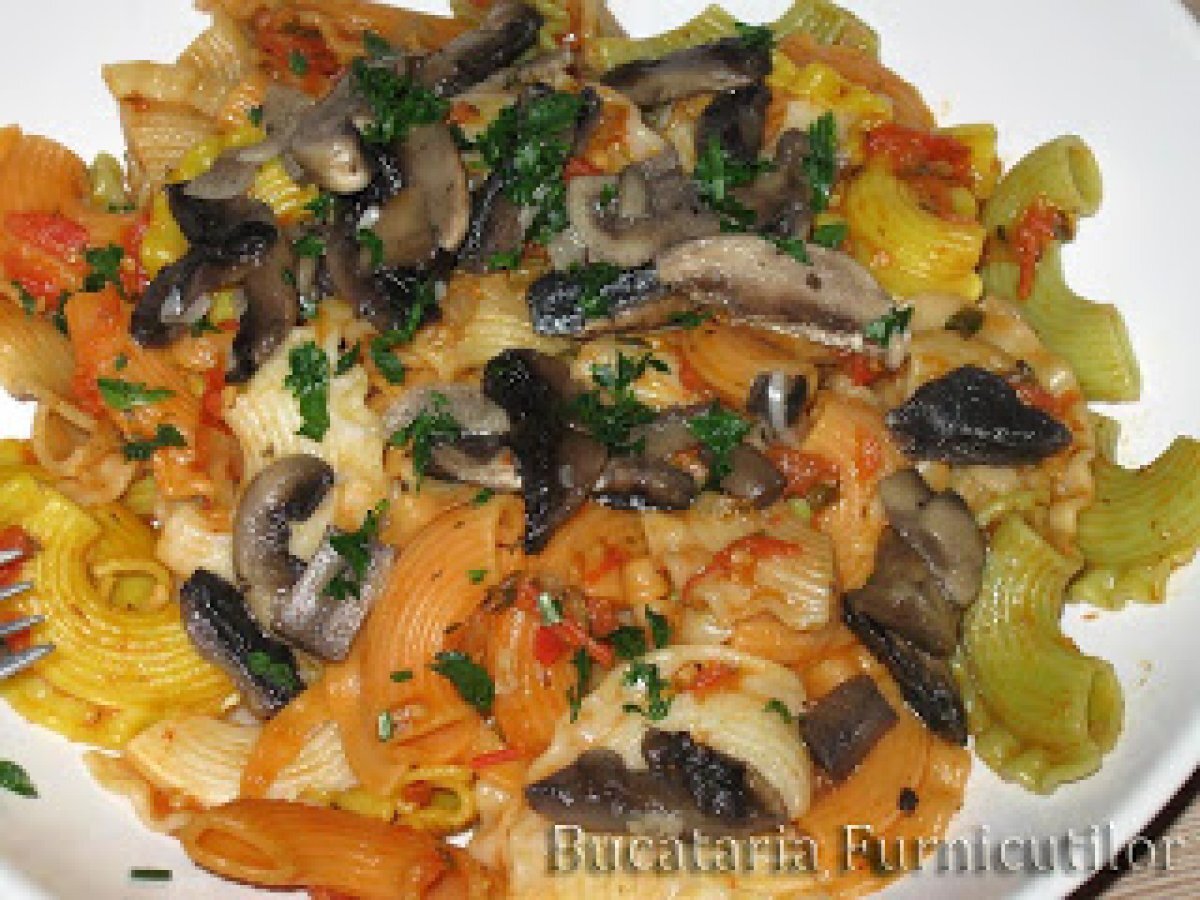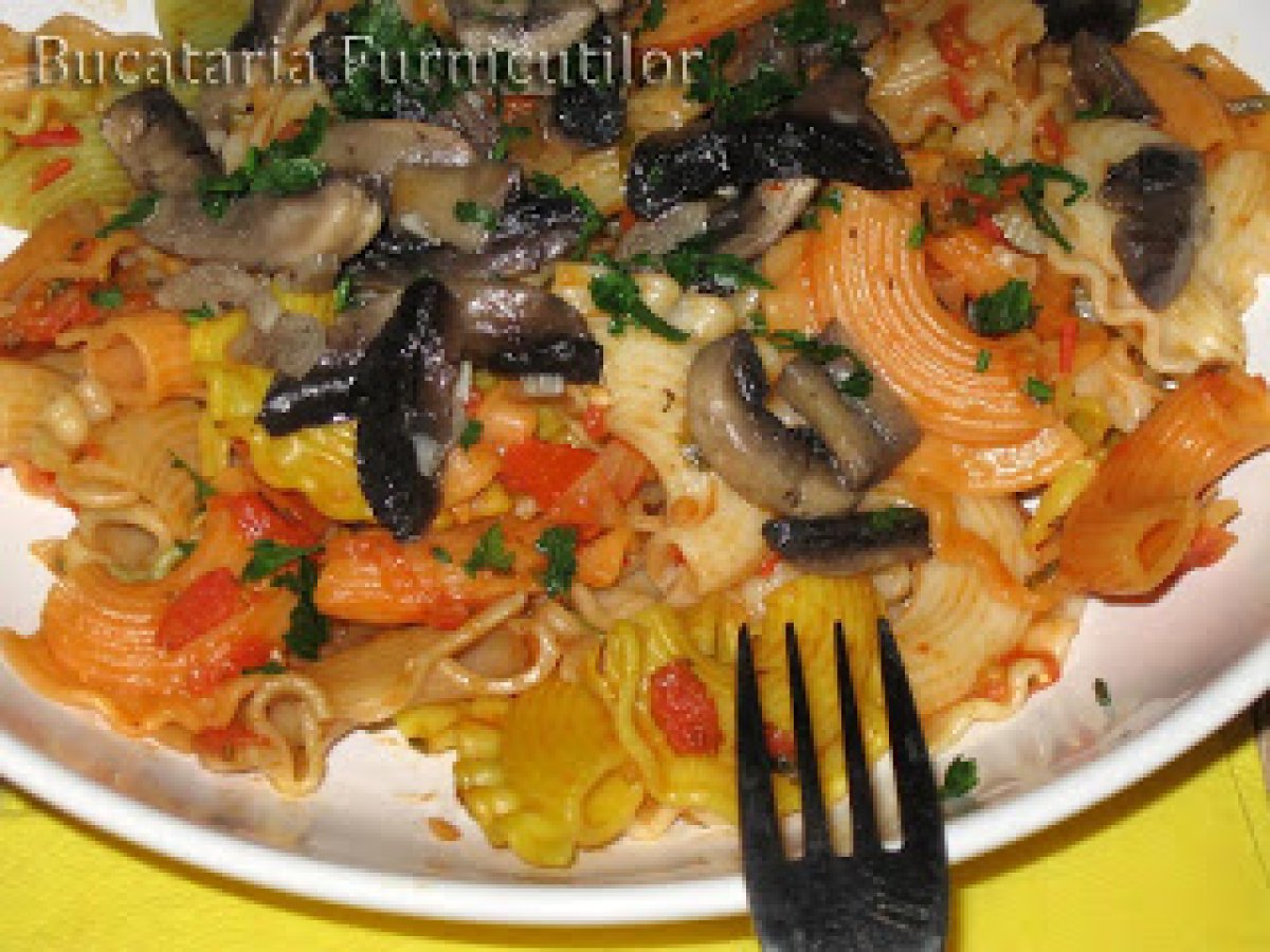 Paste picante cu ciuperci PrecedentulUrmătorul Felul principalFoarte ușor40 min Trimite unui prieten Printează pagina Adresează o întrebare autorului Postează o poză cu rețeta gătită de tine Ingrediente 2 200 g paste 1 - 2 rosii mari 300 g ciuperci 1 ceapa 1 - 2 ardei iuti cateva tulpini telina 1 catel usturoi 2 - 3 linguri ulei sare, cimbru patrunjel pentru decor
