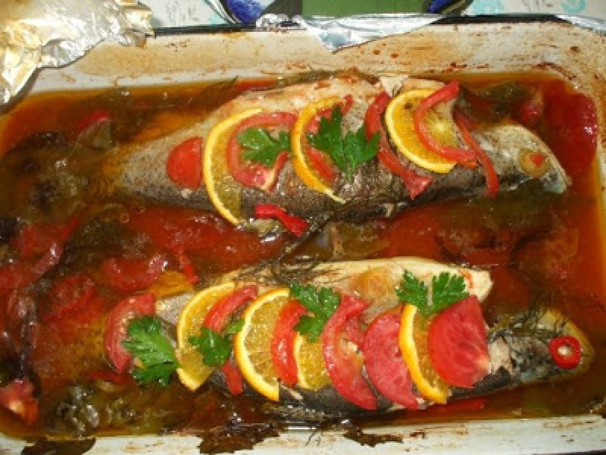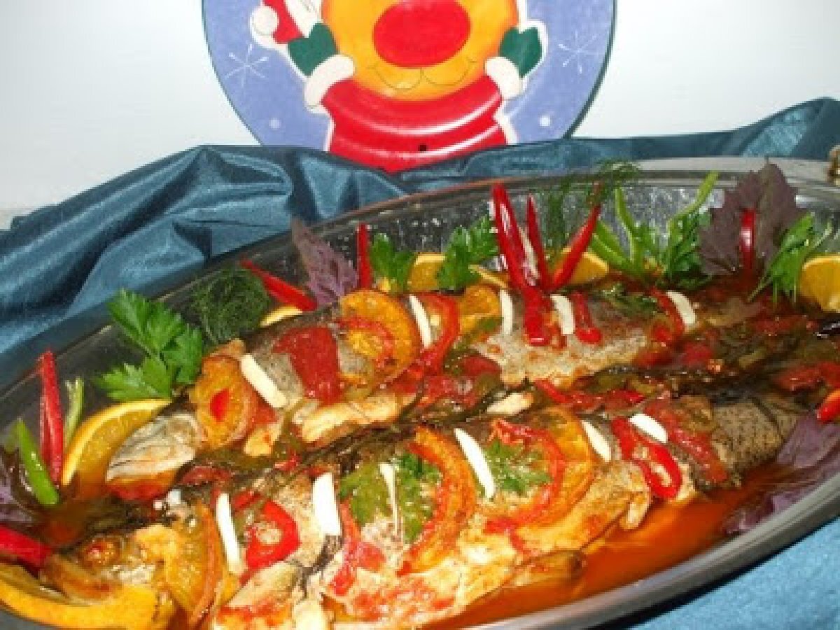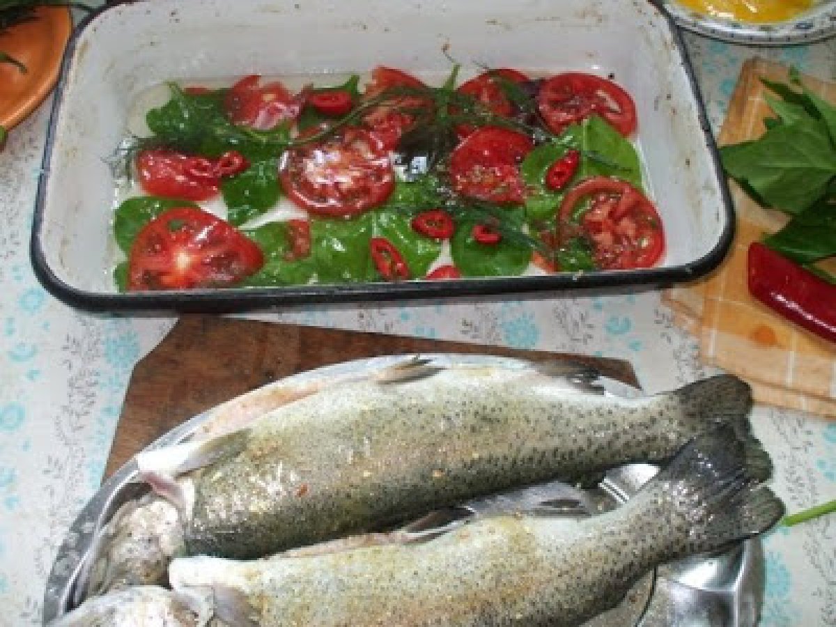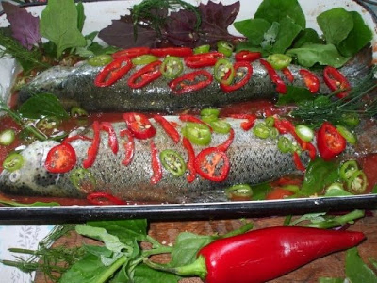 Pastrav cu portocale si sos picant PrecedentulUrmătorul Felul principalFoarte ușor50 min Trimite unui prieten Printează pagina Adresează o întrebare autorului Postează o poză cu rețeta gătită de tine Ingrediente 4 2-3 pastravi medii 1 portocala (sau 1 lamaie) 1-2 ardei iuti (rosu sau verde) 1-2 rosii 1 ardei rosu kapia 3-4 catei de usturoi cateva frunze loboda rosie, spanac cateva fire de marar si patrunjel 1 pahar vin alb 50 ml bulion 3 linguri otet sare, piper, condimente pentru peste 1-2 foi de dafin