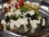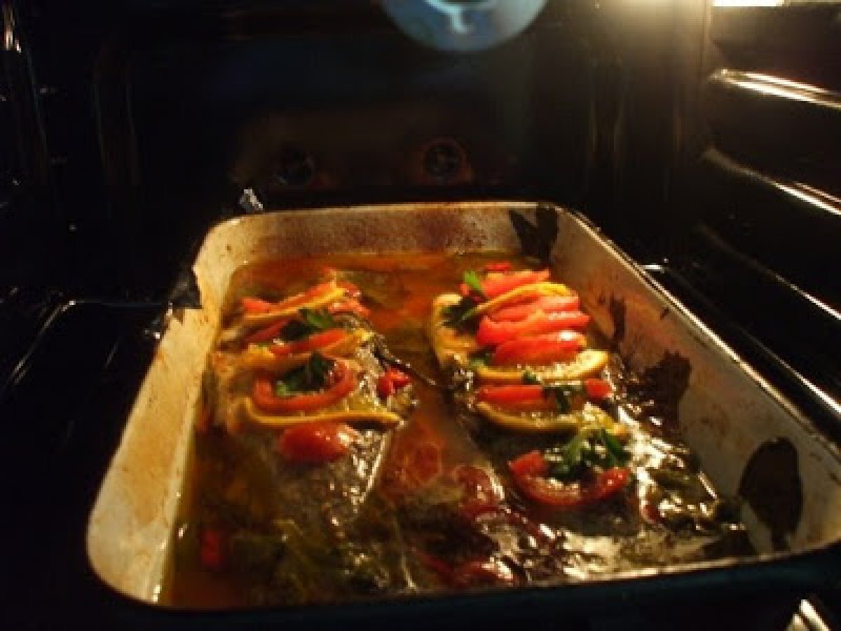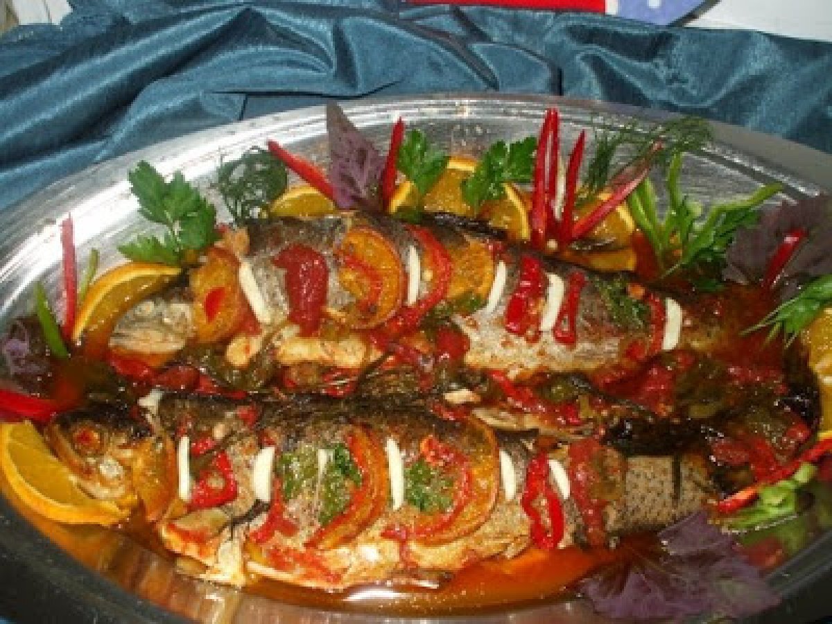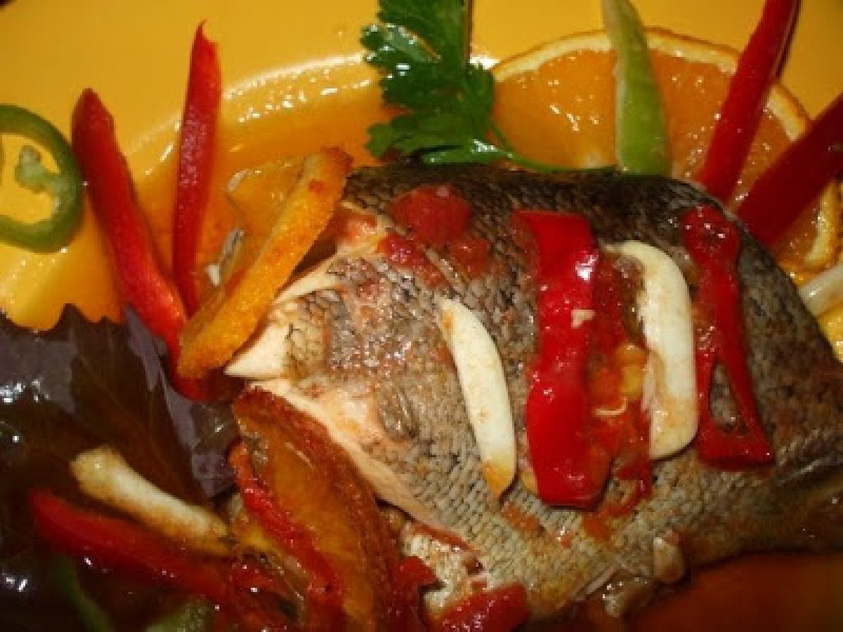 Pastrav cu portocale si sos picant PrecedentulUrmătorul Felul principalFoarte ușor50 min Trimite unui prieten Printează pagina Adresează o întrebare autorului Postează o poză cu rețeta gătită de tine Ingrediente 4 2-3 pastravi medii 1 portocala (sau 1 lamaie) 1-2 ardei iuti (rosu sau verde) 1-2 rosii 1 ardei rosu kapia 3-4 catei de usturoi cateva frunze loboda rosie, spanac cateva fire de marar si patrunjel 1 pahar vin alb 50 ml bulion 3 linguri otet sare, piper, condimente pentru peste 1-2 foi de dafin