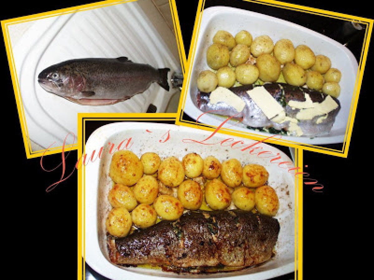 Pastrav de somon cu cartofi la cuptor PrecedentulUrmătorul Felul principalFoarte ușor1 h 30 m Trimite unui prieten Printează pagina Adresează o întrebare autorului Postează o poză cu rețeta gătită de tine Ingrediente 8 1 peste ca 1-1,5kg. verdeturi bdupa dorinta 4-5 catei usturoi ulei nde masline unt sare+piper cartofi in prealabil fierti si descojiti.