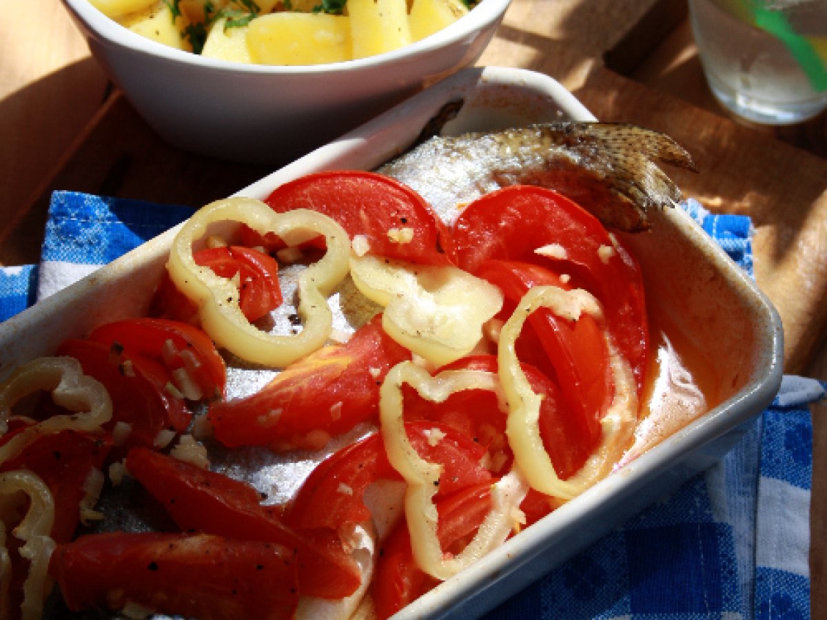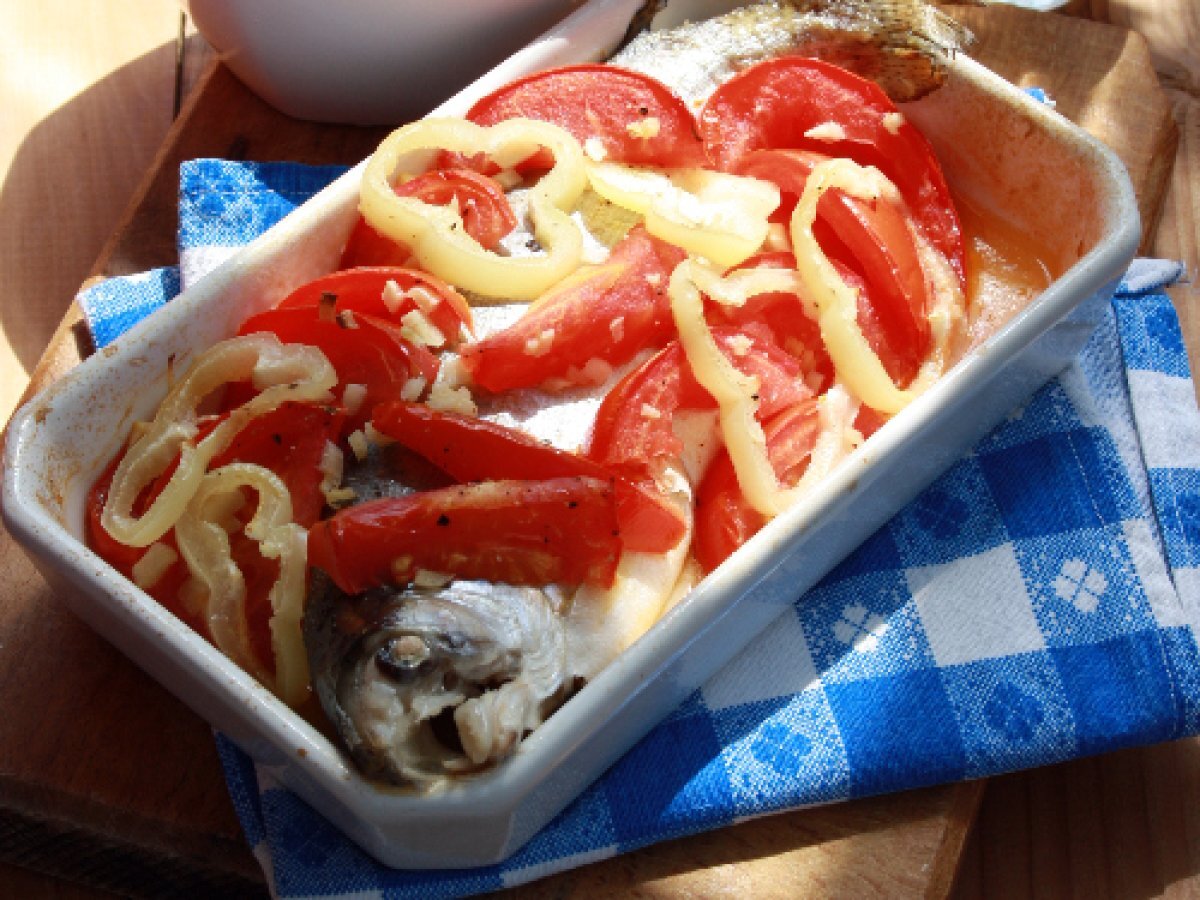 Pastrav la cuptor cu rosii si oregano PrecedentulUrmătorul Felul principalFoarte ușor30 min Trimite unui prieten Printează pagina Adresează o întrebare autorului Postează o poză cu rețeta gătită de tine Ingrediente 4 1 pastrav 1 rosie mare si coapta 1 ardei gras usturoi lamaie ulei de masline sare de mare piper oregano proaspat