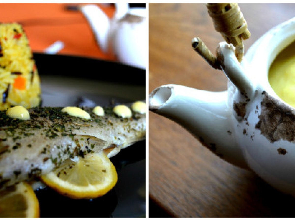 Pastrav la cuptor cu sos de lamaie si orez cu legume