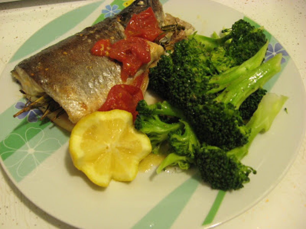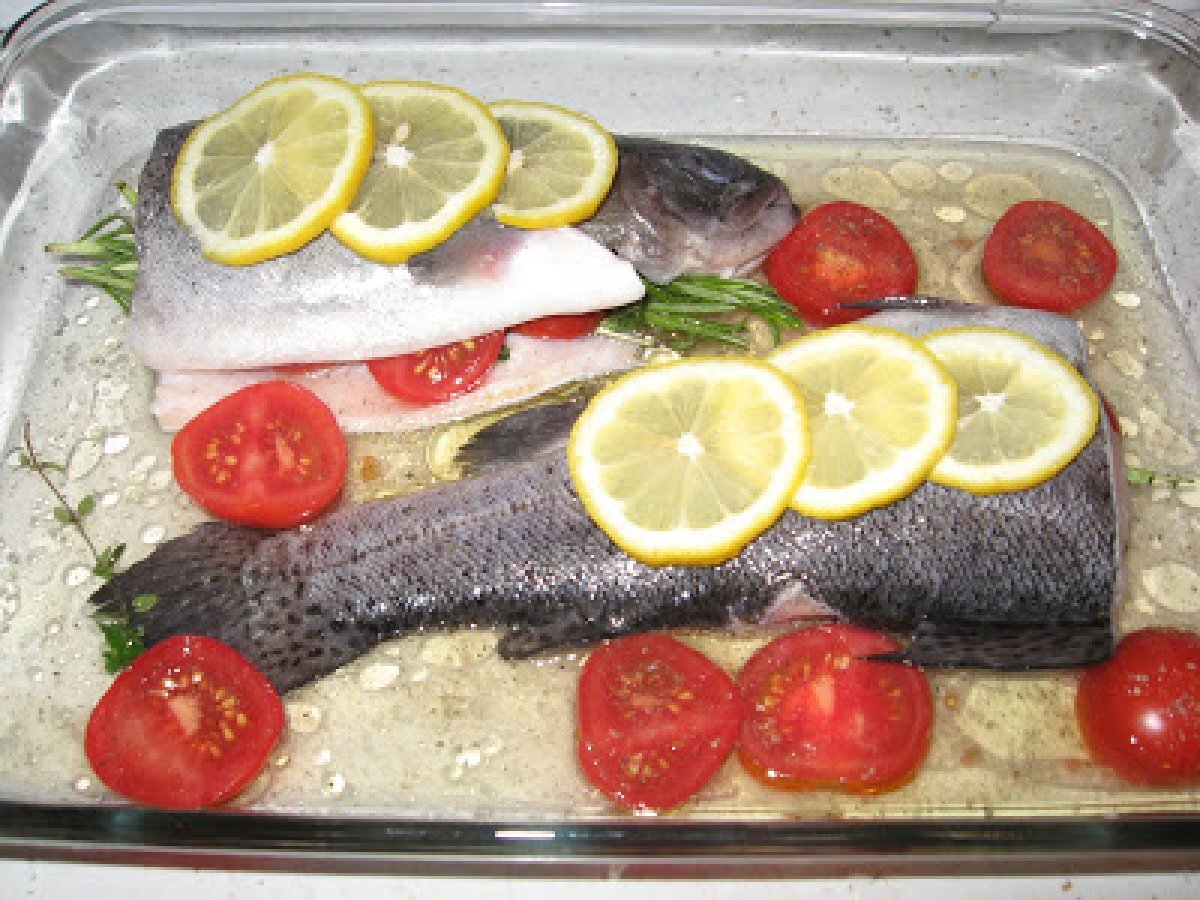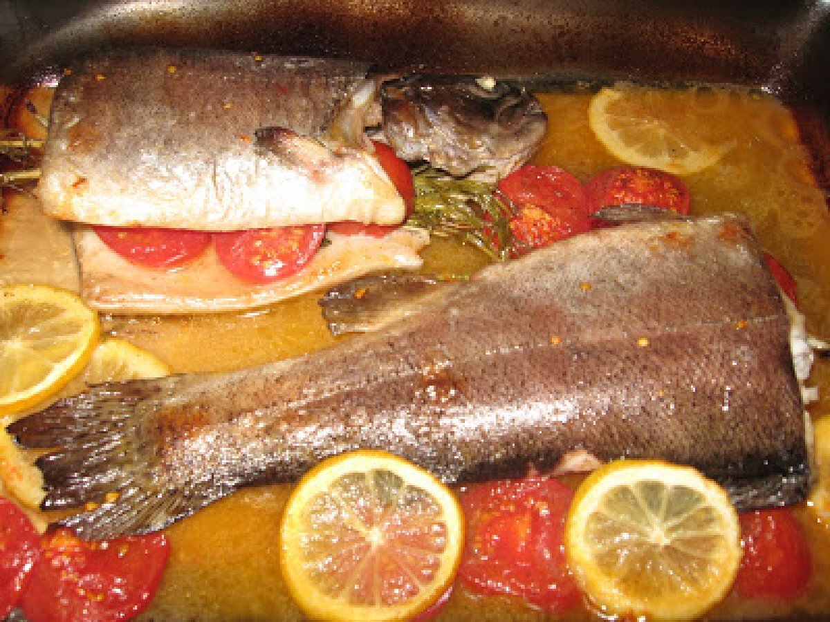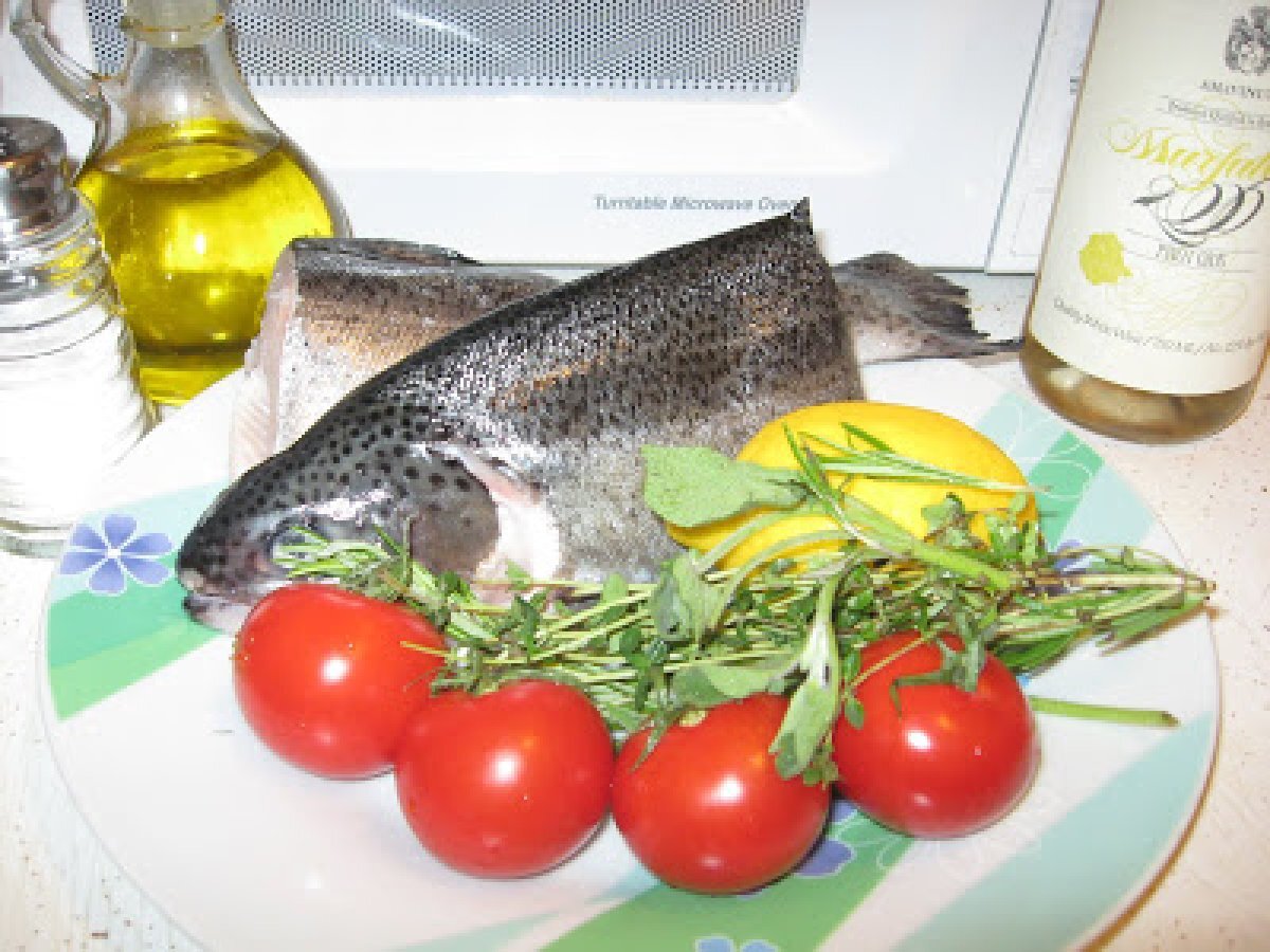 Pastrav la cuptor cu vin si ierburi aromate PrecedentulUrmătorul Felul principalFoarte ușor50 min Trimite unui prieten Printează pagina Adresează o întrebare autorului Postează o poză cu rețeta gătită de tine Ingrediente 4 1 pastrav 1 cana de vin alb (250 ml) 1 legatura de rozmarin, cimbru si salvie cateva rosii mici (mi se par mult mai gustoase) sare, piper, ulei de masline cateva felii de lamaie