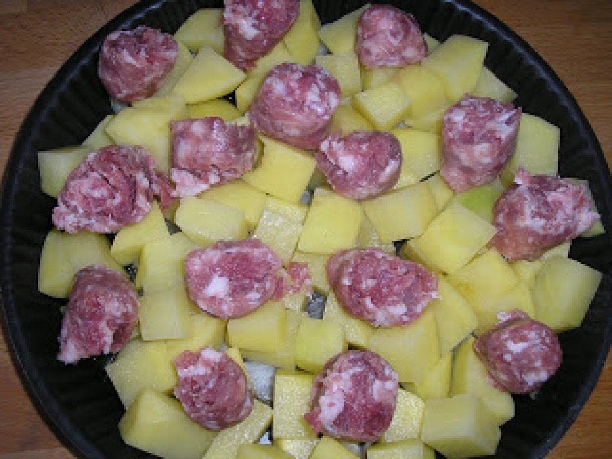 Patate con salsiccia al forno (cartofi cu carnati la cuptor) PrecedentulUrmătorul Felul principalFoarte ușor45 min Trimite unui prieten Printează pagina Adresează o întrebare autorului Postează o poză cu rețeta gătită de tine Ingrediente 4 2 patate grandi, 2 cipolle, 3 salsicce toscane poco olio 2 cartofi mari, 2 cepe, 3 bucati de carnat proaspat, un pic de ulei.