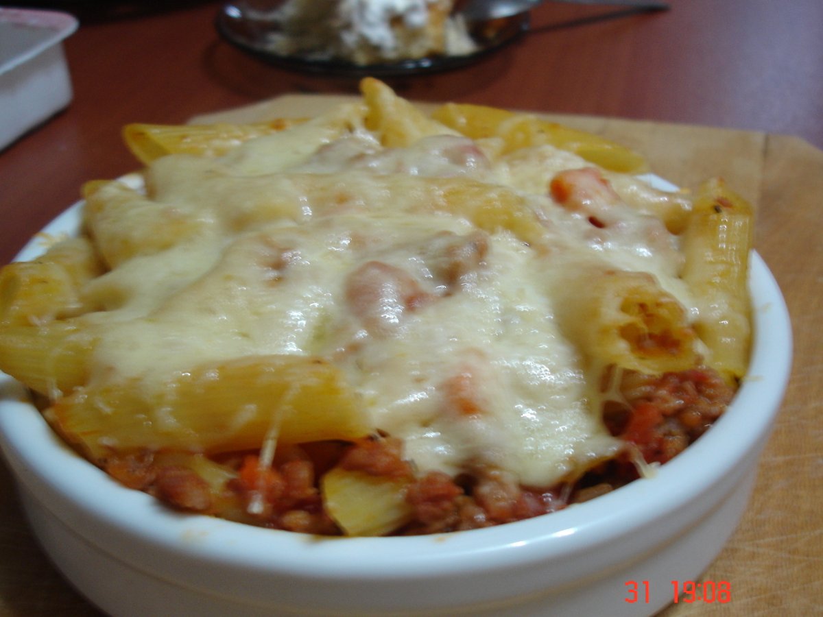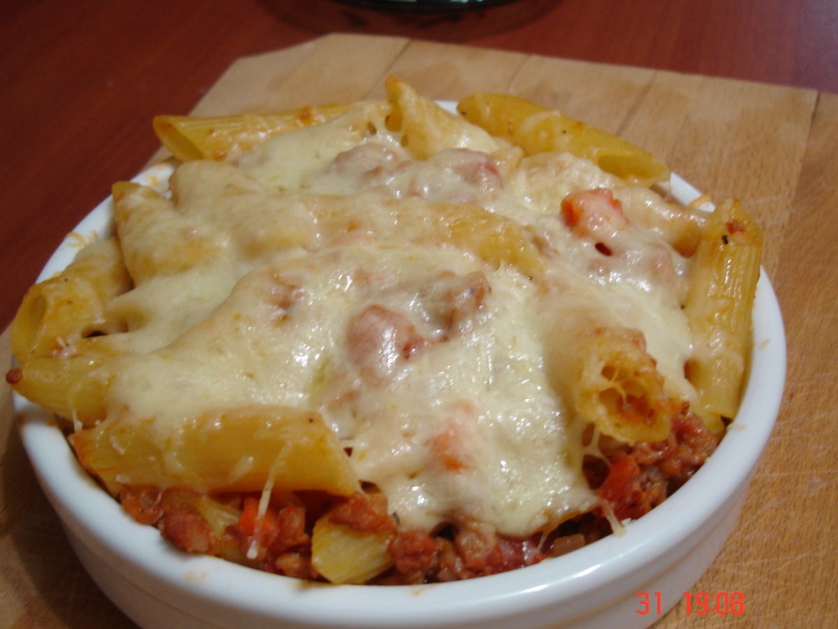 Penne al forno PrecedentulUrmătorul Felul principalFoarte ușor40 min Trimite unui prieten Printează pagina Adresează o întrebare autorului Postează o poză cu rețeta gătită de tine Ingrediente 1 penne pentru o persoana (100-125g) carne tocata (150g) 1 ceapa mica 1 morcov mic 50ml vin alb 1/2 cutie cu rosii cuburi sau 1 ceasca cu suc de rosii cascaval ras si parmesan (50-70g) sare, piper, busuioc uscat