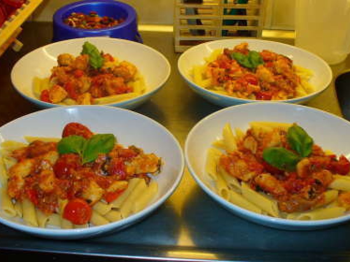 Penne rigate cu piept de pui PrecedentulUrmătorul Felul principalUșor50 min Trimite unui prieten Printează pagina Adresează o întrebare autorului Postează o poză cu rețeta gătită de tine Ingrediente 4 paste pennne rigate piept pui dezosat 2 ardei grasii rosii o conserva rosii cherry sau rosii cherry proaspete busuioc ( prospat preferabil) parmezan ras ceapa ardei chilli prosciutto crudo