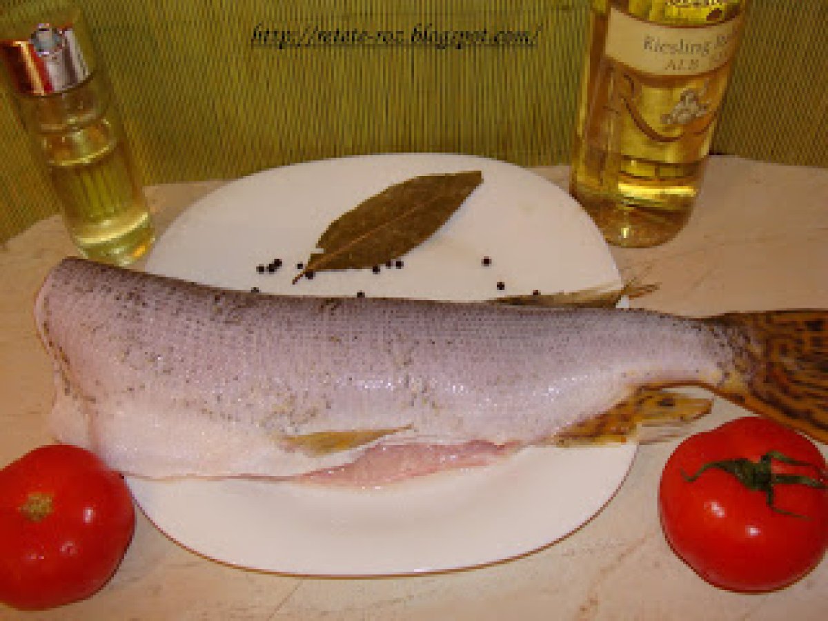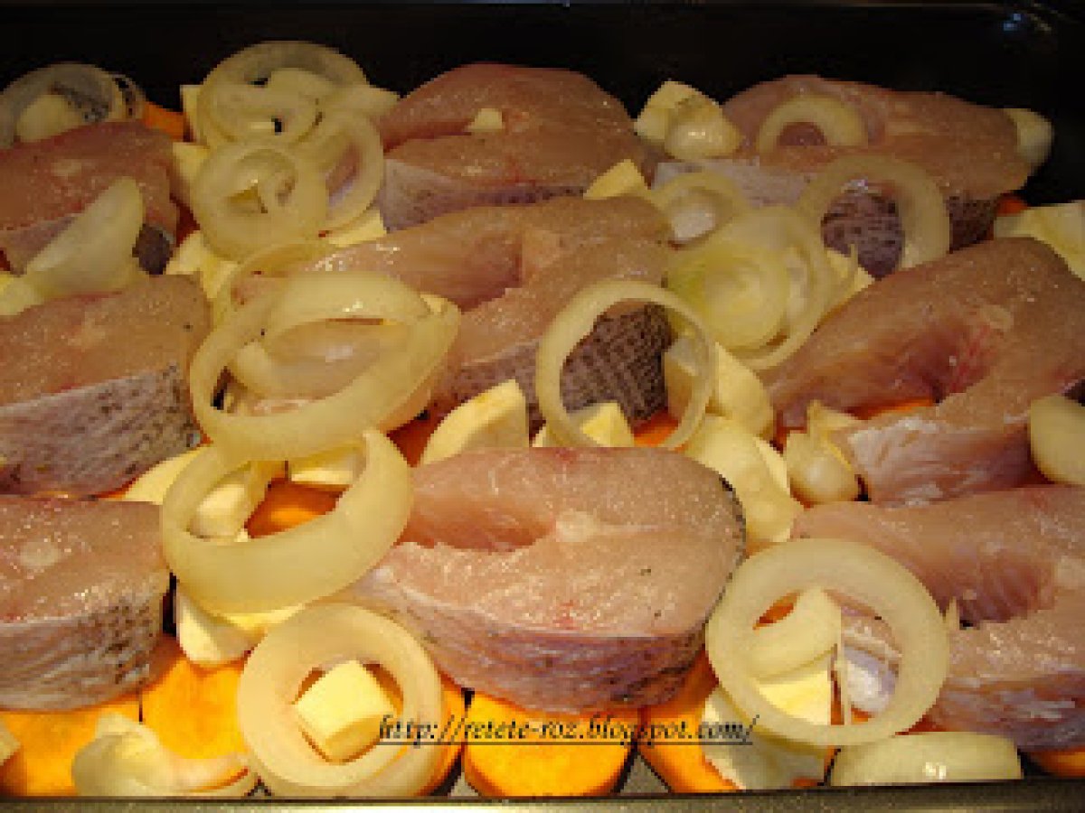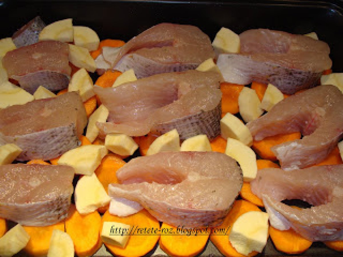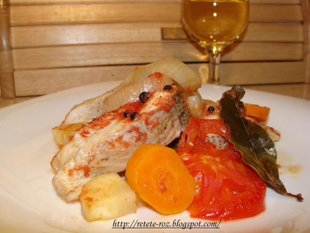 Peste cu legume la cuptor PrecedentulUrmătorul Felul principalFoarte ușor40 min Trimite unui prieten Printează pagina Adresează o întrebare autorului Postează o poză cu rețeta gătită de tine Ingrediente 8 1,5 kg stiuca 2 morcovi mari sau 3 mai mici 1 radacina patrunjel 2 cepe potrivite 6 catei usturoi 2 rosii 200 ml apa 200 ml ulei 200 ml vin alb 150 ml suc de rosii piper boabe foi de dafin sare zeama de la 1/2 lamaie