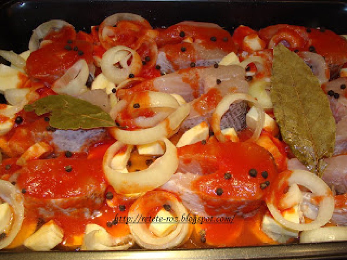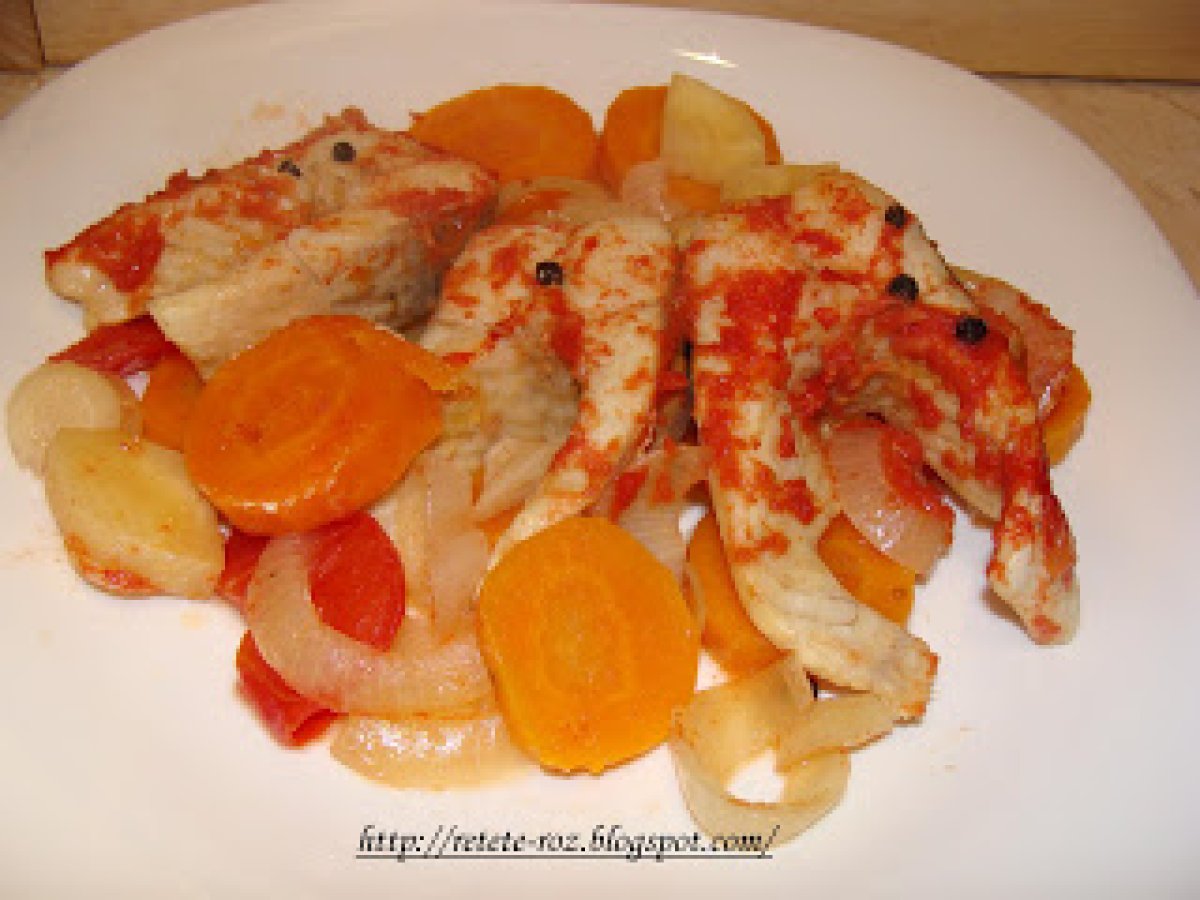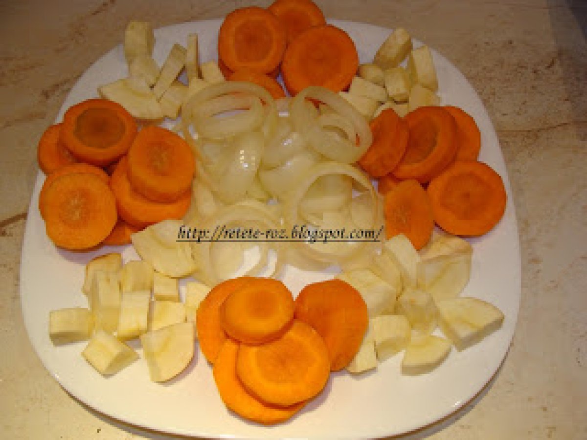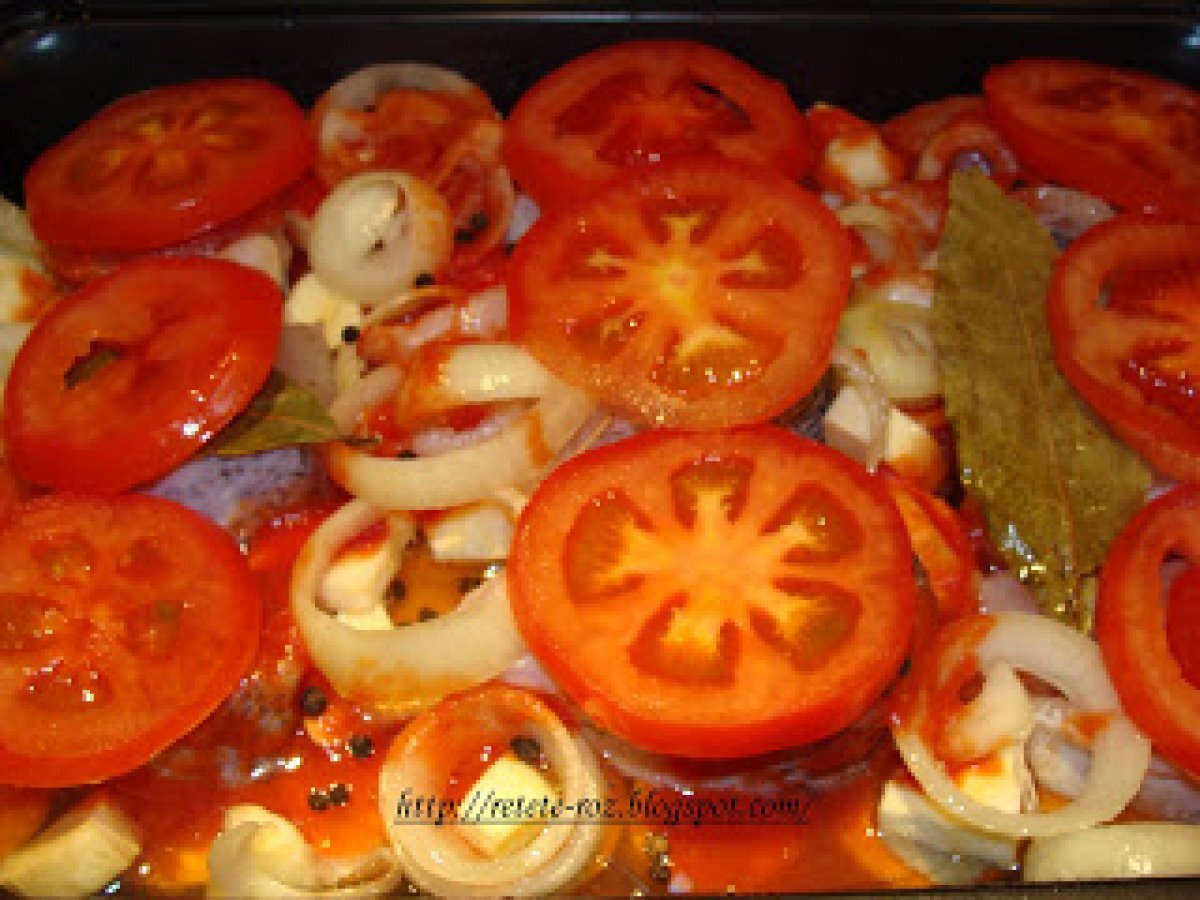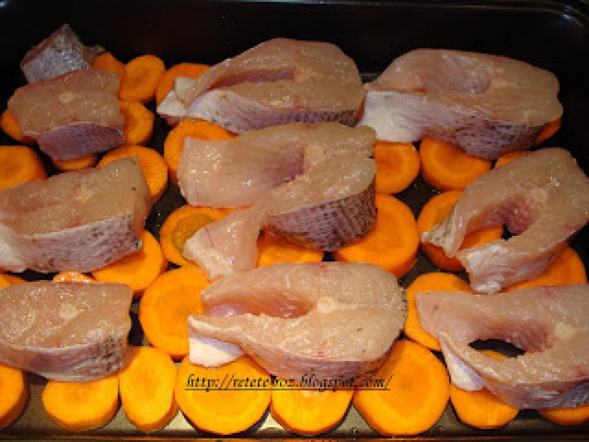 Peste cu legume la cuptor PrecedentulUrmătorul Felul principalFoarte ușor40 min Trimite unui prieten Printează pagina Adresează o întrebare autorului Postează o poză cu rețeta gătită de tine Ingrediente 8 1,5 kg stiuca 2 morcovi mari sau 3 mai mici 1 radacina patrunjel 2 cepe potrivite 6 catei usturoi 2 rosii 200 ml apa 200 ml ulei 200 ml vin alb 150 ml suc de rosii piper boabe foi de dafin sare zeama de la 1/2 lamaie