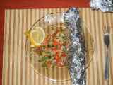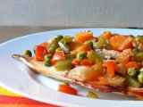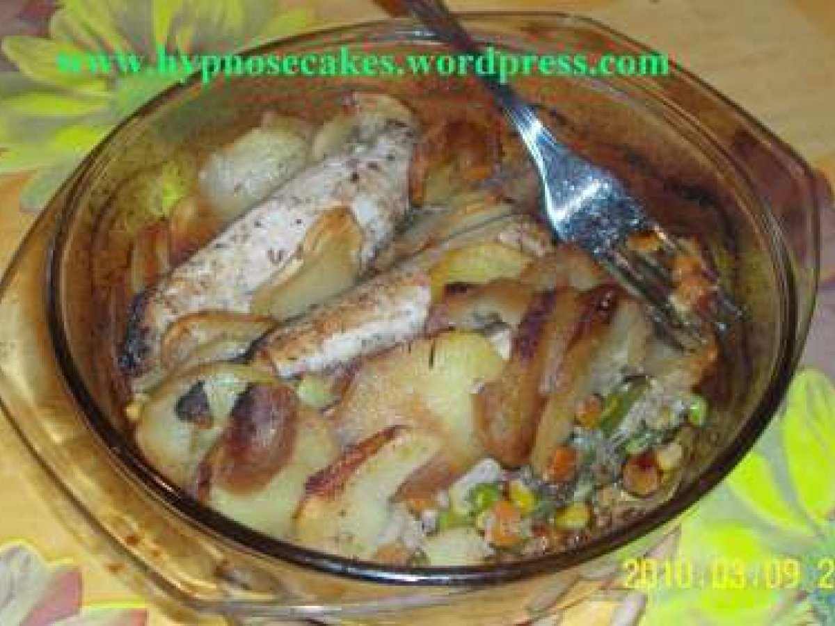 Peste file cu legume la cuptor Felul principalUșor50 min Trimite unui prieten Printează pagina Adresează o întrebare autorului Postează o poză cu rețeta gătită de tine Ingrediente 3 3 bucati peste file 200 g mix de legume (congelate) 4 cartofi 1 ceapa 5 catei de usturoi 4 linguri unt ½ lamaie Sare, piper