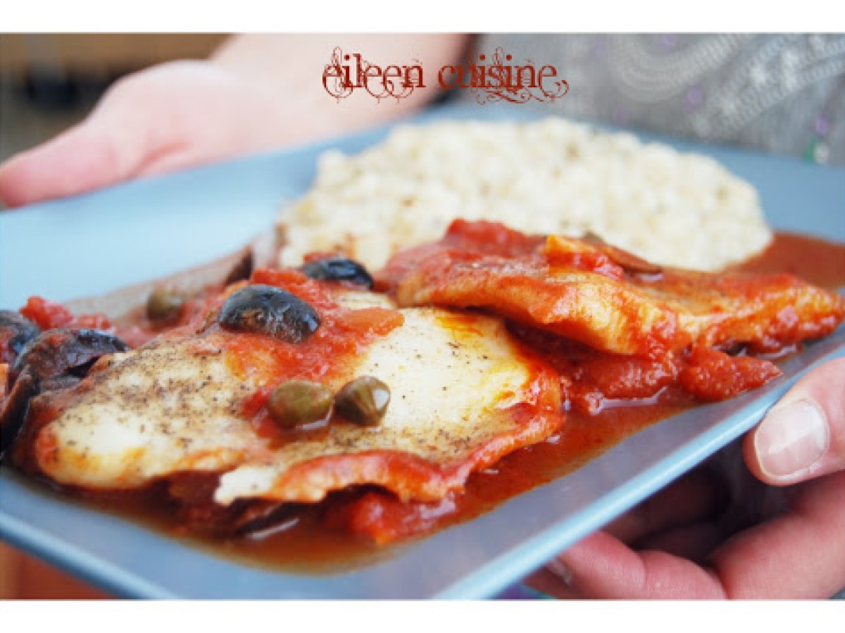 Peste la cuptor cu rosii si vin rosu Felul principalFoarte ușor35 min Trimite unui prieten Printează pagina Adresează o întrebare autorului Postează o poză cu rețeta gătită de tine Ingrediente 4 3 catei usturoi Ulei masline 2 conserve rosii tocate 1 pahar vin rosu 2 linguri capere 1 mana masline 8 fileuri de peste alb fara piele