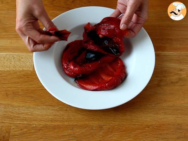 Puneți ardeii copți într-o pungă pentru congelator, închideți punga și lăsați să stea 10 minute. Deschideți punga și curățați ardeii.