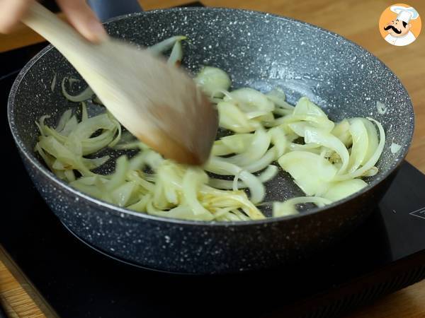 Tăiați ceapa fâșii și căliți-o într-o tigaie cu ulei de măsline și puțină sare. Puneți deoparte când devine translucidă.