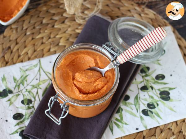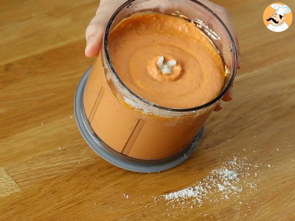 Punți ardeiul gras, ceapa, ricotta, pecorino, parmezanul, pasta de tomate, sarea și uleiul de măsline într-un blender și amestecați până obțineți un sos cremos.