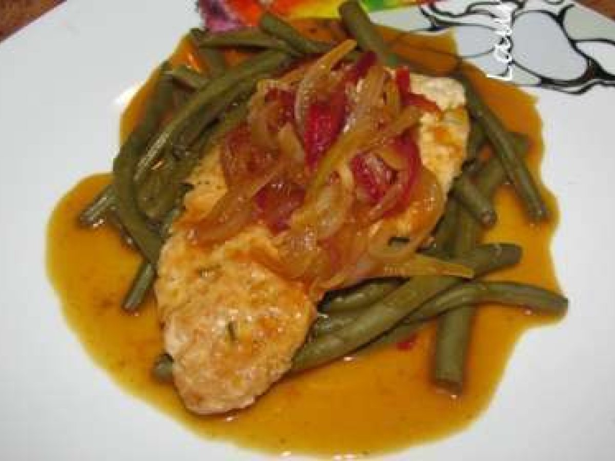 Piept de curcan cu fasole verde si sos dulce de ceapa Felul principalUșor30 min Trimite unui prieten Printează pagina Adresează o întrebare autorului Postează o poză cu rețeta gătită de tine Ingrediente 4 coaja rasa si sucul de la 1 portocala coaja rasa si sucul de la 1 lamaie 3 linguri miere ½ lingurita piper negru 2 cepe, curatate si taiate suvite 2 catei de usturoi, tocati marunt 4 bucati piept de curcan (a cate 100 gr) 400 gr fasole verde, din conserva 2 linguri unt