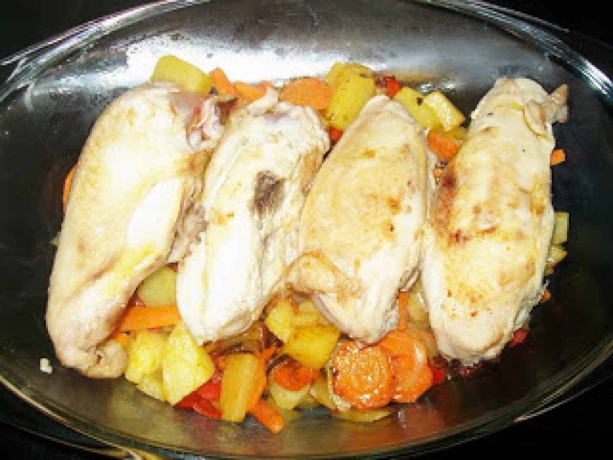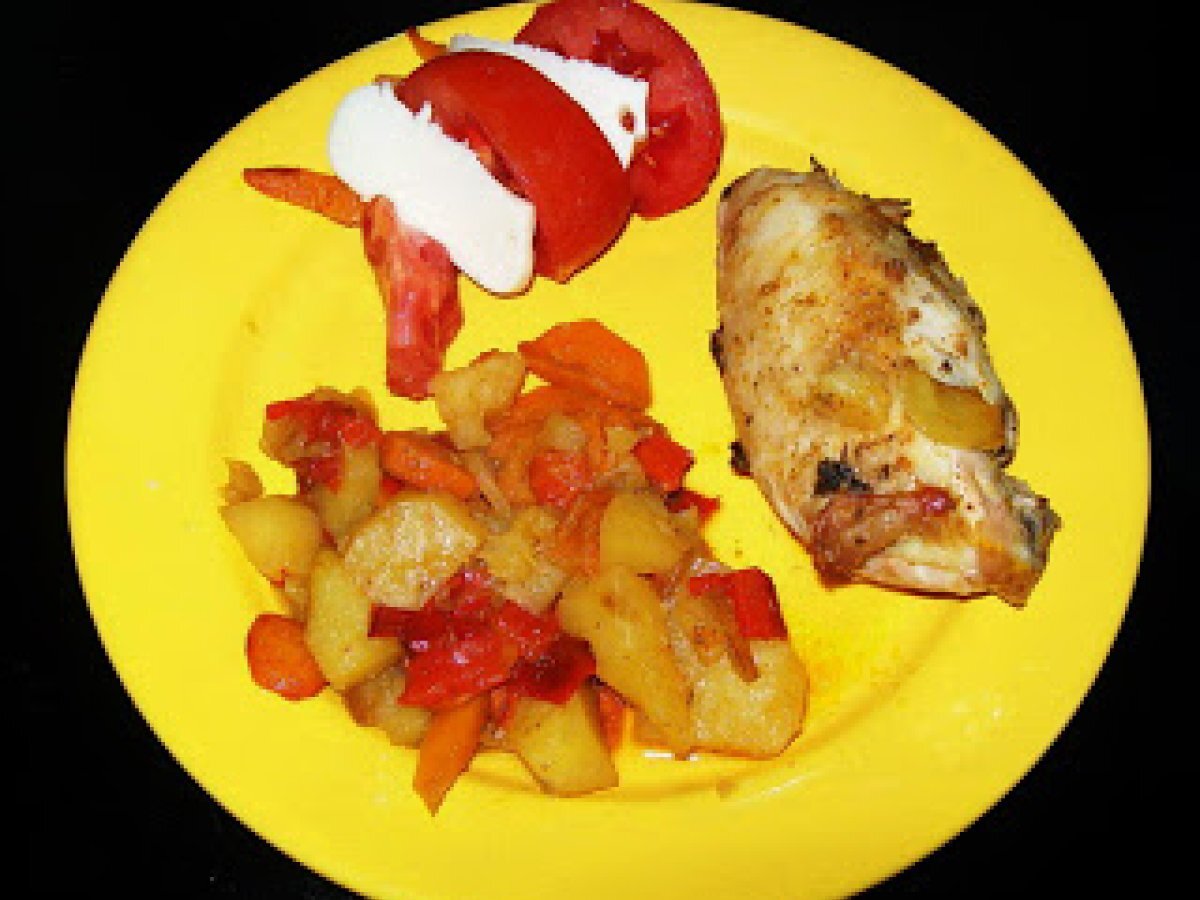 Piept de pui cu legume sote PrecedentulUrmătorul Felul principalFoarte ușor40 min Trimite unui prieten Printează pagina Adresează o întrebare autorului Postează o poză cu rețeta gătită de tine Ingrediente 2 2 piepti pui 1 ardel capia 1 ardel gras galben o ceapa 3-4 cartofi 3 morcovi sare,piper,oregano,busuioc,boia dulce