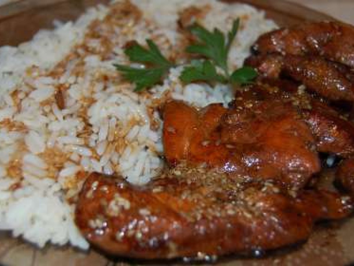 Piept de pui cu sos de soia, lamaie si susan Felul principalUșor50 min355 Kcal Trimite unui prieten Printează pagina Adresează o întrebare autorului Postează o poză cu rețeta gătită de tine Ingrediente 4 500 gr piept de pui 1 ceapa mica 2 linguri ulei 2 lingurite ghimbir ras coaja de la o lamaie zeama de la o lamaie 60 ml supa de pui 2 linguri otet de orez, 3 linguri sos de soia, 50 gr seminte susan Cost estimat: 9.5Euros€ (2.37€/porție)
