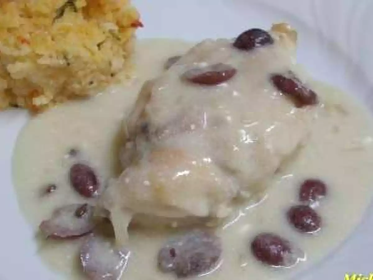 Piept de pui cu struguri Felul principalUșor45 min Trimite unui prieten Printează pagina Adresează o întrebare autorului Postează o poză cu rețeta gătită de tine Ingrediente 4 o ceapa mica, 50 gr struguri negri, 3 linguri ulei, 4 bucati de piept de pui, sare, piper, 1 lingura unt, 1 lingura faina, 125 ml vin alb, 125 ml smantana.