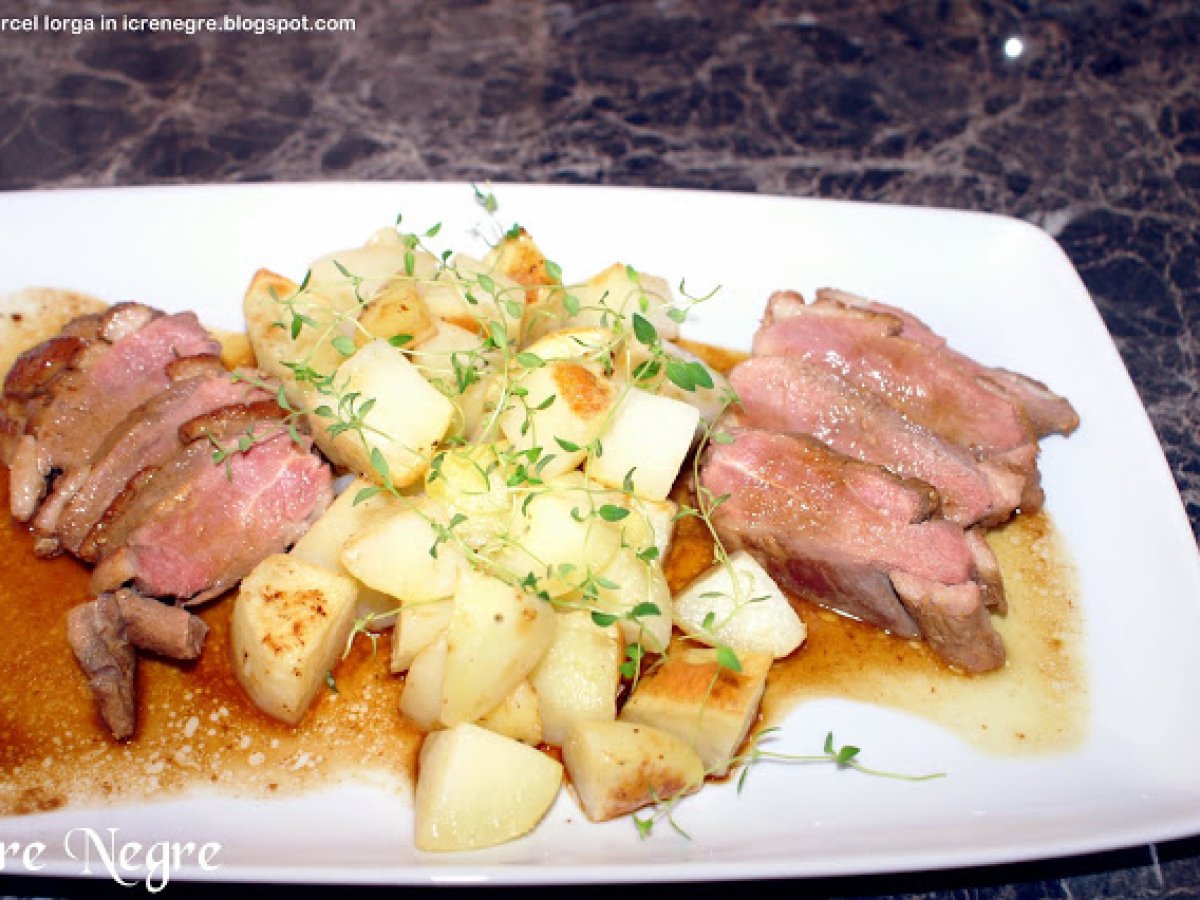 Piept de ra cu sos de portocale PrecedentulUrmătorul Felul principalFoarte ușor50 min Trimite unui prieten Printează pagina Adresează o întrebare autorului Postează o poză cu rețeta gătită de tine Ingrediente 4 1 piept de ra 1 portocala, sucul si coaja 2 linguri de miere 25 ml de cognac de buna calitate 4 linguri de sos de soia 250 ml de fond de pui 300 g de cartofi pentru garnitura 1 cubulet de unt sare si piper dupa gust cateva fire de cimbrisor proaspat pentru ornare