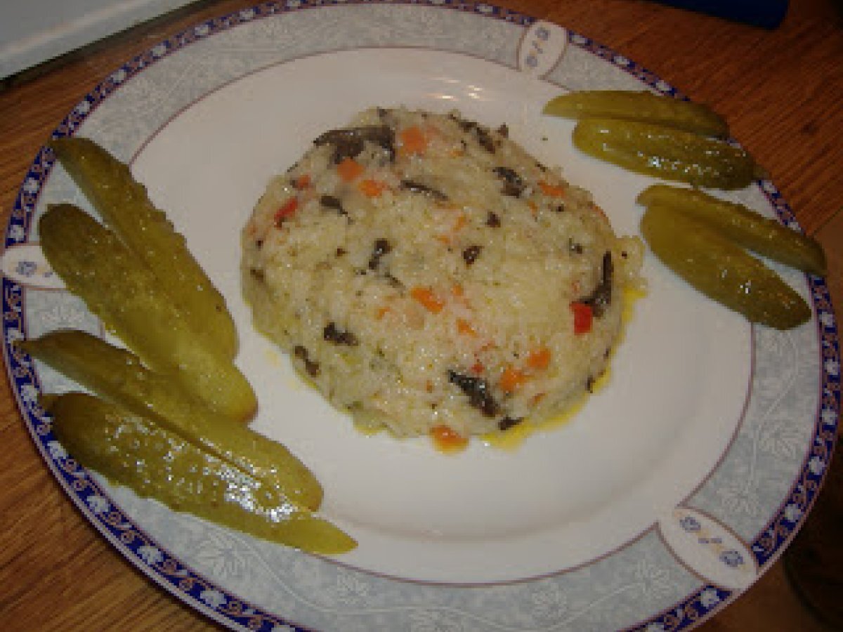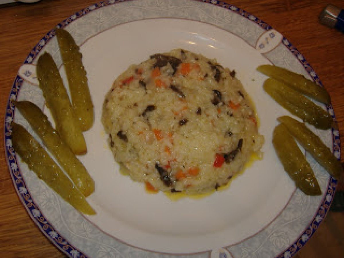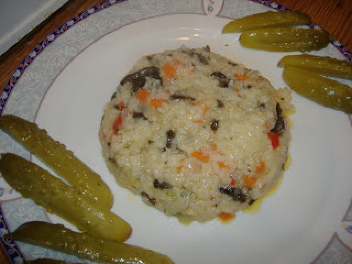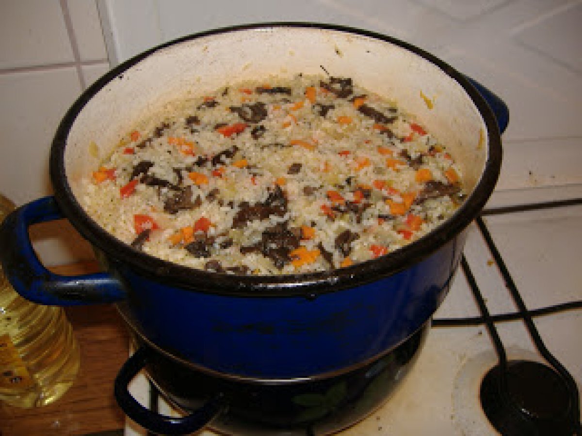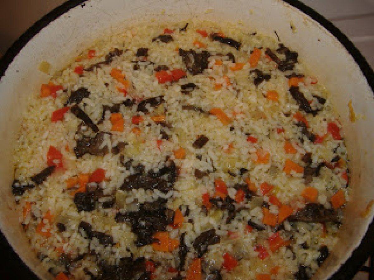 Pilaf cu ciuperci PrecedentulUrmătorul Felul principalFoarte ușor40 min697 Kcal Trimite unui prieten Printează pagina Adresează o întrebare autorului Postează o poză cu rețeta gătită de tine Ingrediente 2 1 cana orez 4 cani apa 2-3 ling ulei 2 cepe 1 morcov 1 gogosar rosu ciuperci sare, piper Cost estimat: 2.3Euros€ (1.15€/porție)