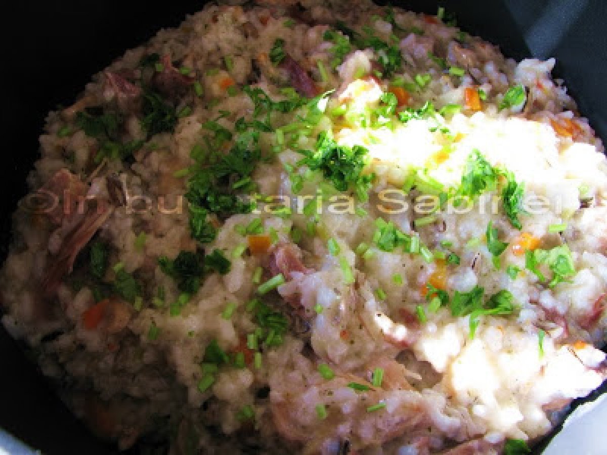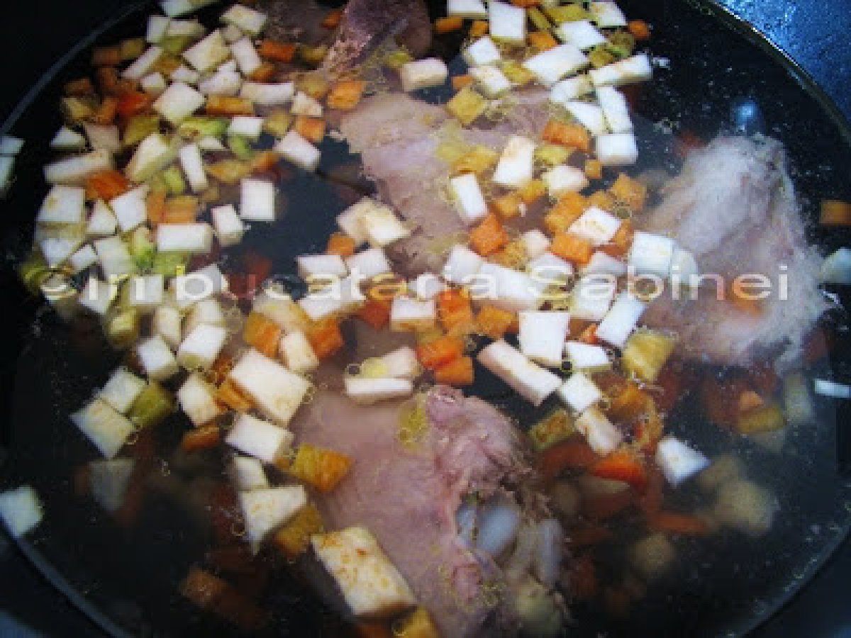 Pilaf de curcan cu legume PrecedentulUrmătorul Felul principalFoarte ușor1 oră Trimite unui prieten Printează pagina Adresează o întrebare autorului Postează o poză cu rețeta gătită de tine Ingrediente 4 carne de curcan (1 copan si 1/2 piept) legume (1 ceapa, 2 morcovi, 1 telina mica, 1 ardei capia) un castron de orez (amestec orez normal si orez salbatic) o cutie de ciuperci legume uscate sare si piper patrunjel proaspat tocat