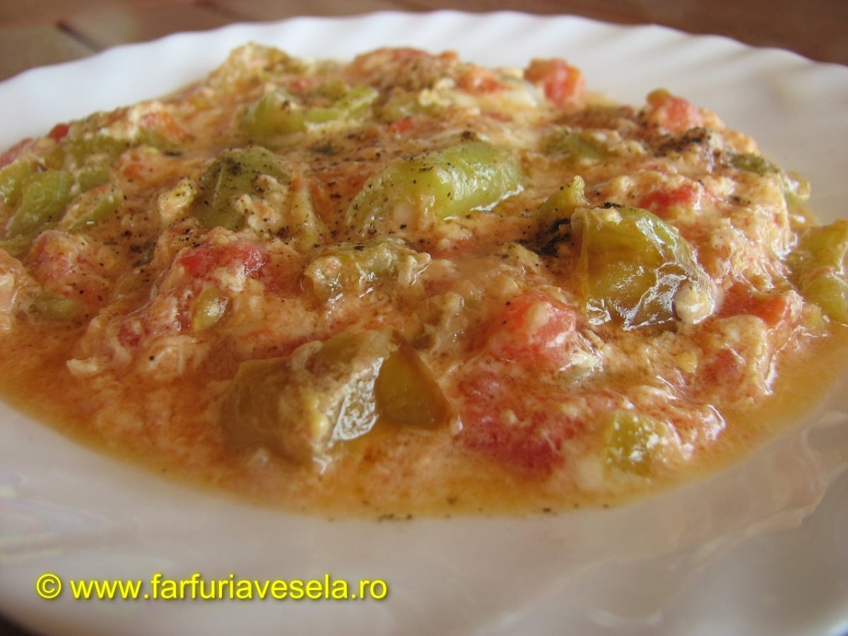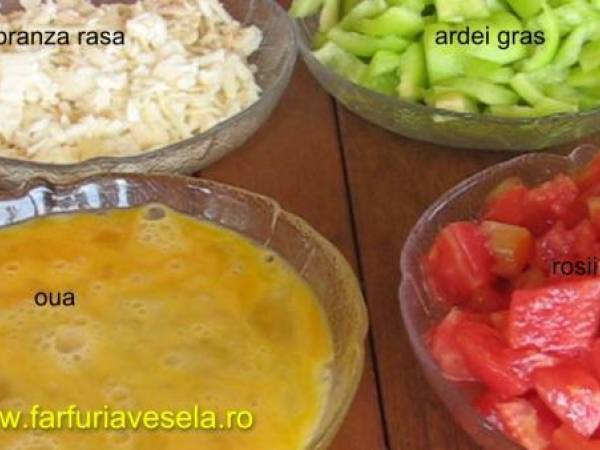 Se pregateste foarte repede, este o reteta colorata cu ardei gras verde, rosii, branza si oua batute. Un deliciu !
