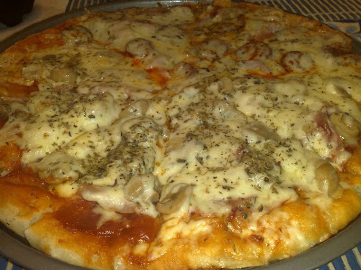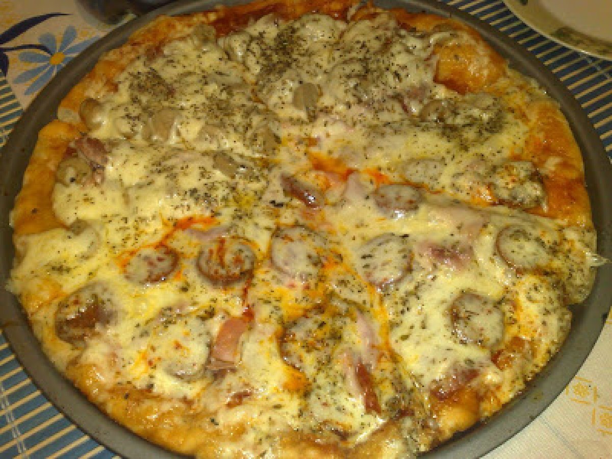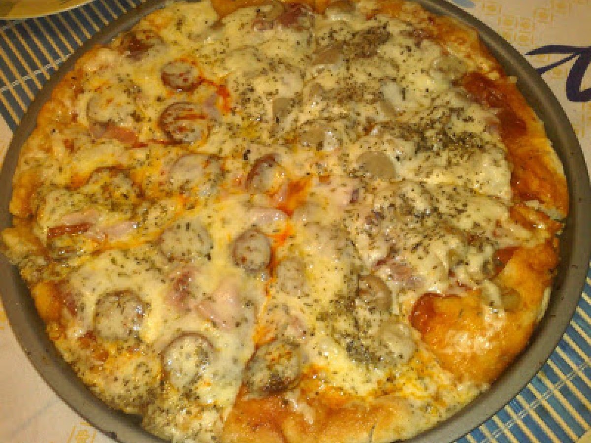 Pizza cu ciuperci si carnati PrecedentulUrmătorul Felul principalFoarte ușor50 min Trimite unui prieten Printează pagina Adresează o întrebare autorului Postează o poză cu rețeta gătită de tine Ingrediente 4 Pentru blat 250 g faina 20 g drojdie sare 1 lingurita zahar 3 linguri ulei 150 ml apa Pentru umplutura pasta de rosii pentru uns blatul 200 g ciuperci din conserva 5 carnati tip trandafir 300 g cascaval razalit oregano 2 linguri ulei de masline 200 g sunca