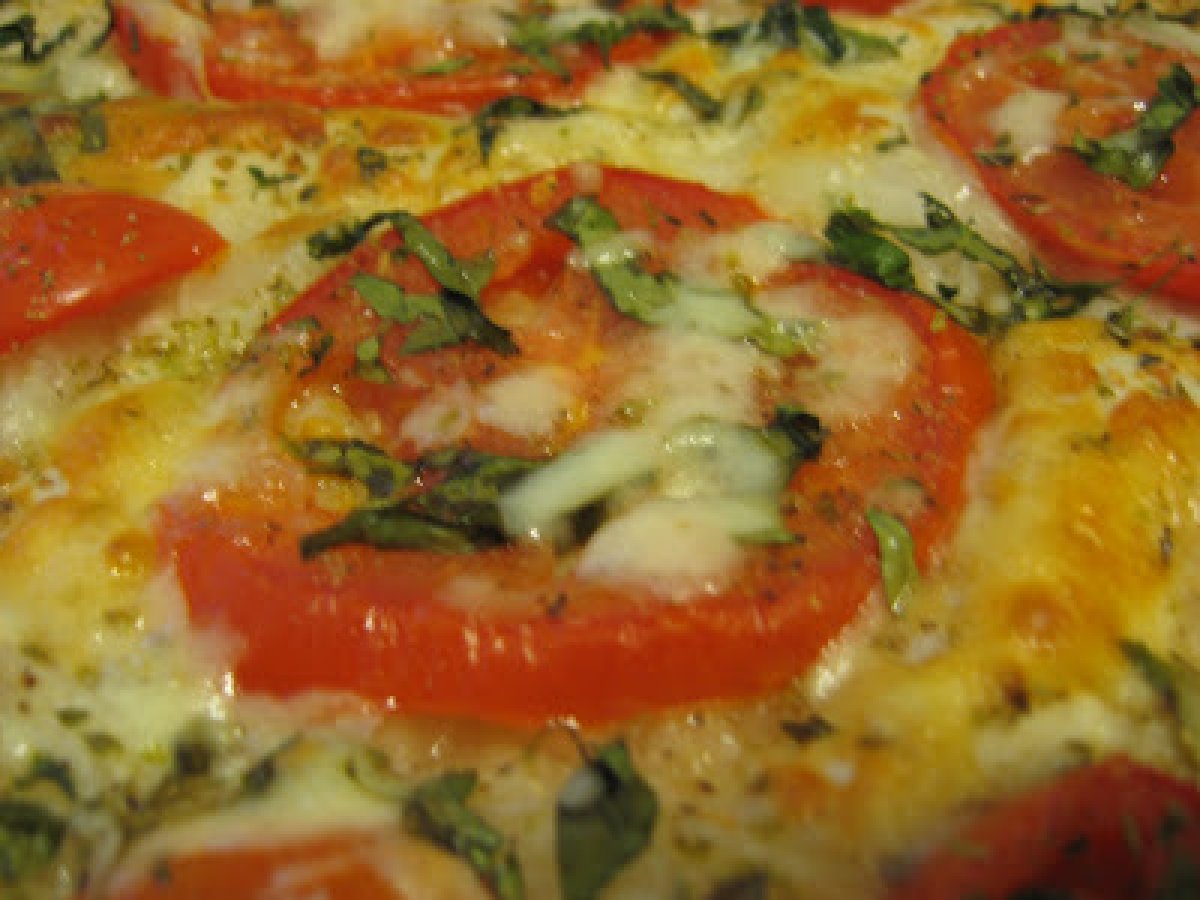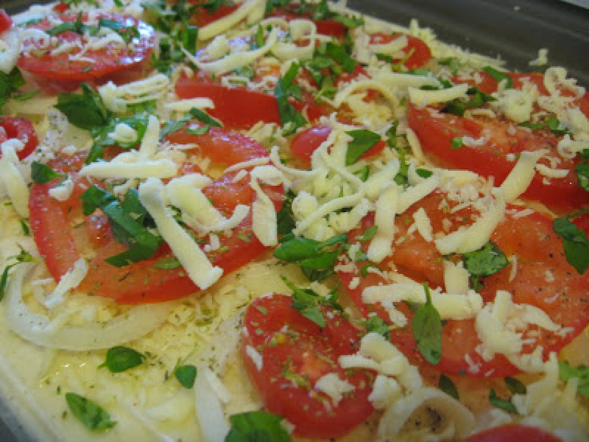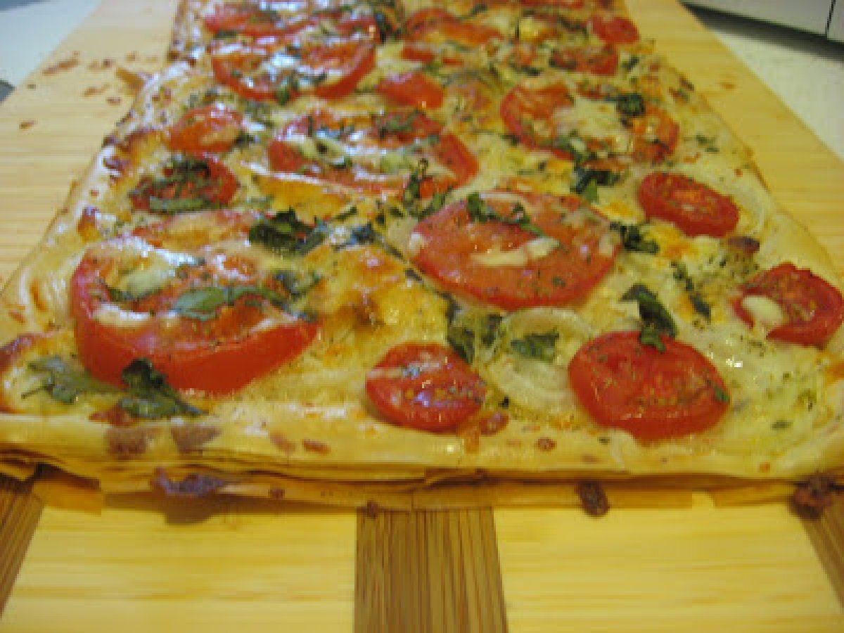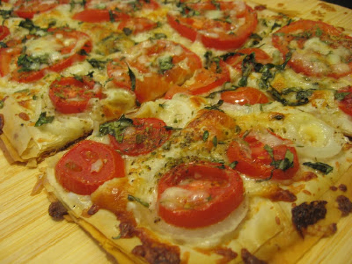 Pizza cu foi fillo PrecedentulUrmătorul Felul principalFoarte ușor30 min Trimite unui prieten Printează pagina Adresează o întrebare autorului Postează o poză cu rețeta gătită de tine Ingrediente 8 4 foi de fillo dough, taiate jumatati 6 linguri de unt topit 1-2 rosii 1 ceapa aprox 300 gr mozzarella si parmesan date pe razatoare cateva frunze de busuioc si cimbru proaspat putin oregano uscat sare si piper