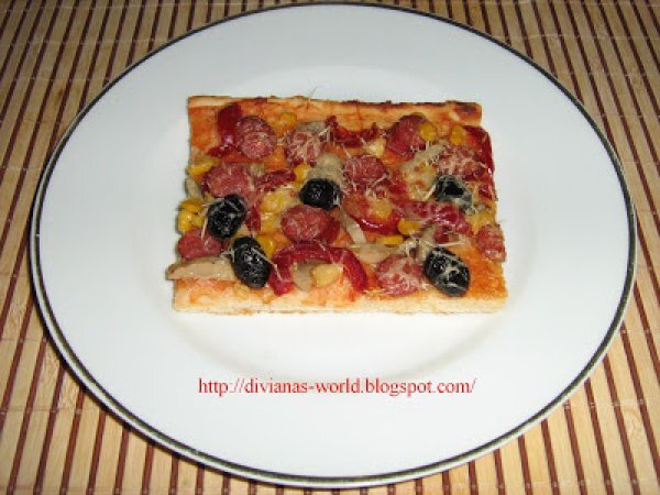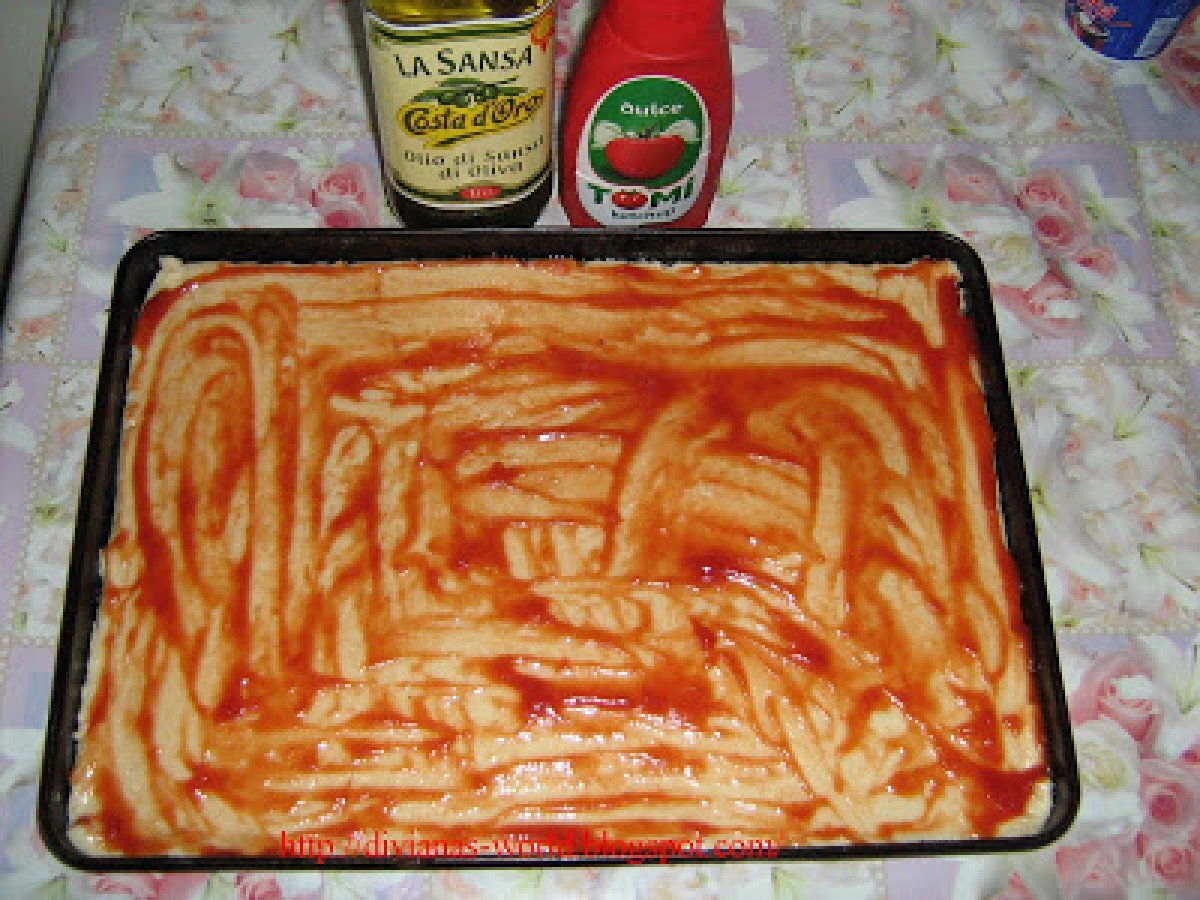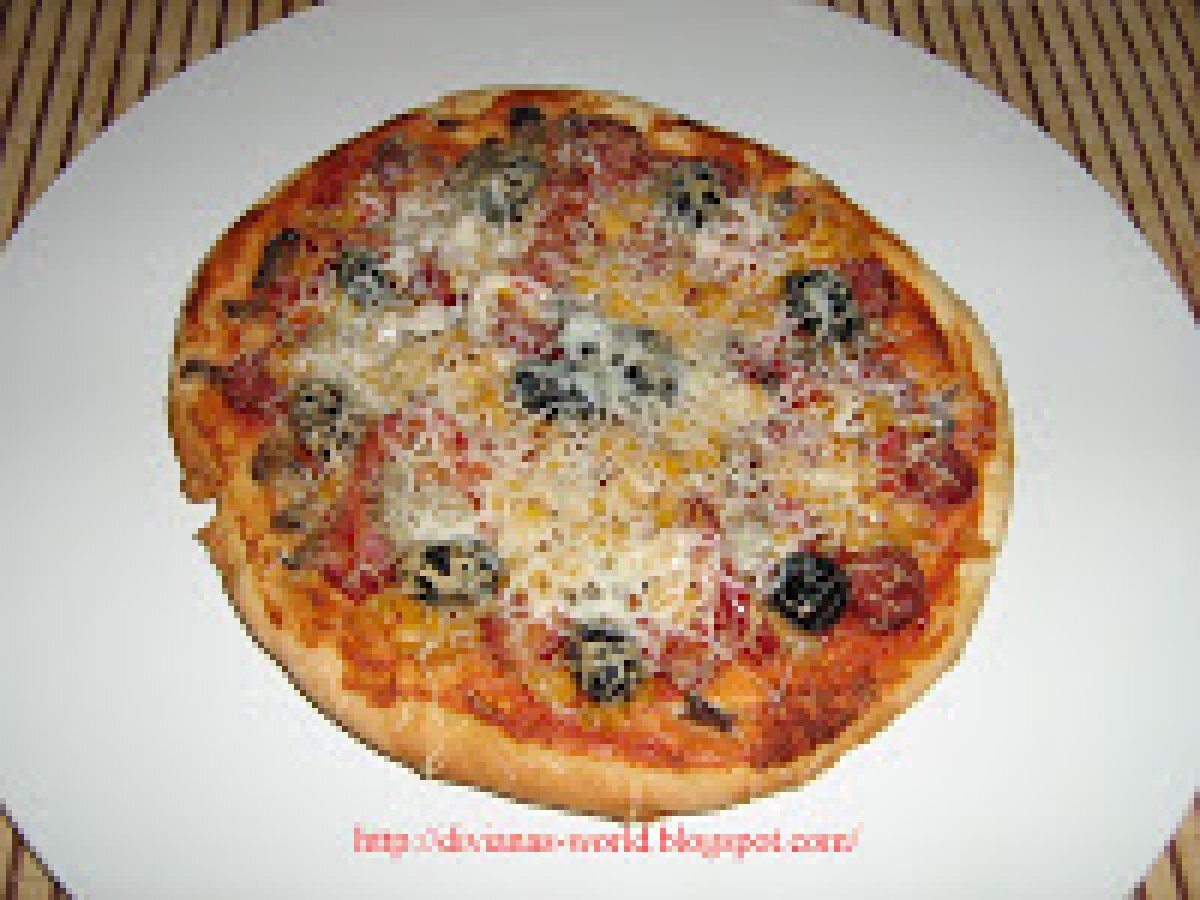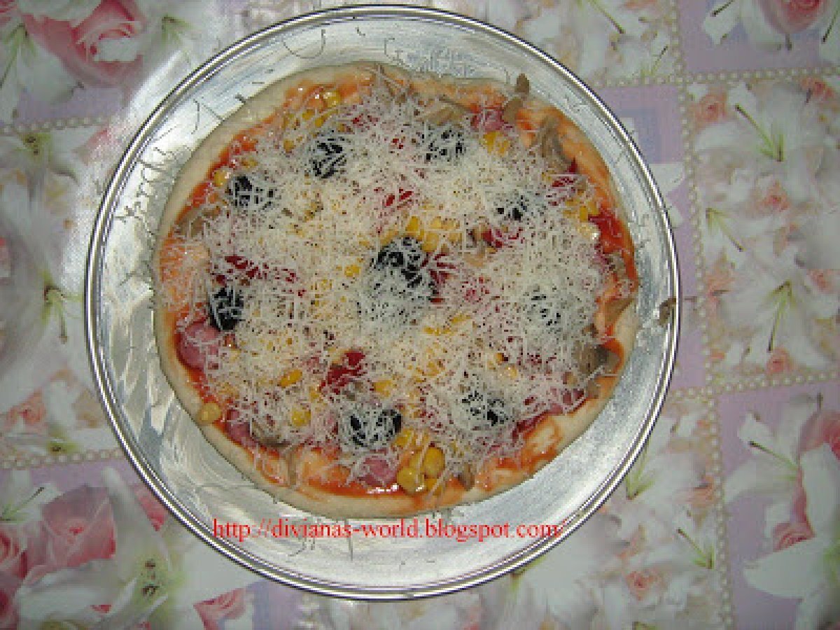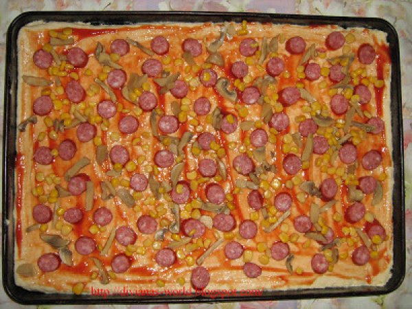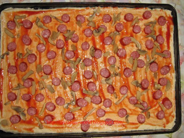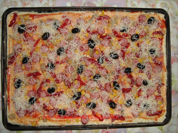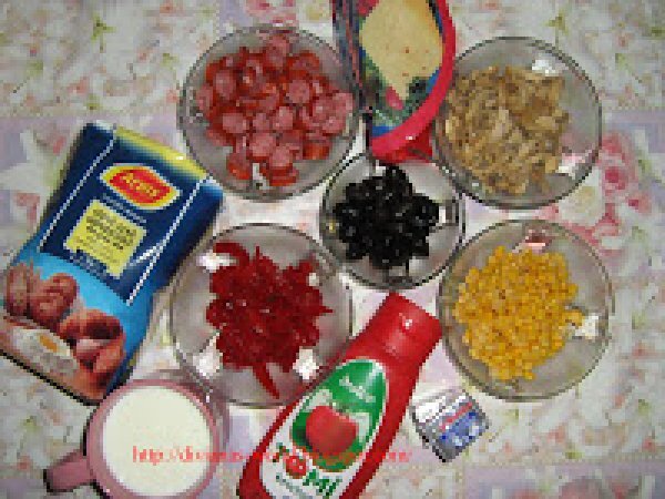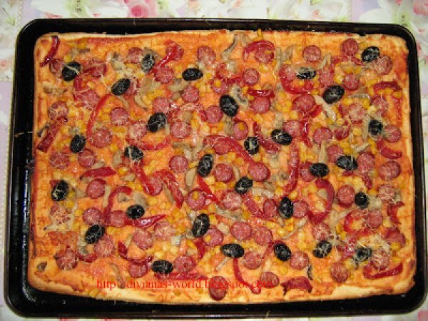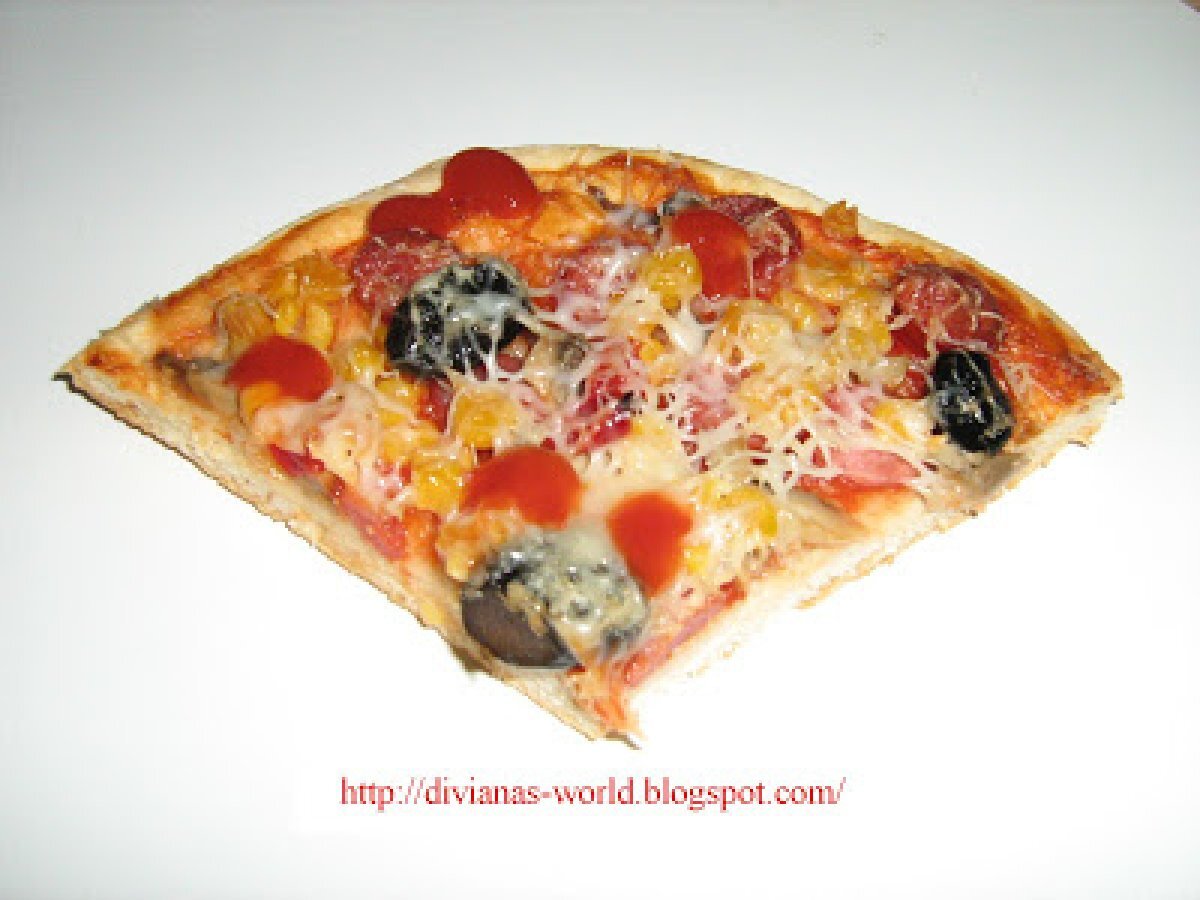 Pizza de casa PrecedentulUrmătorul Felul principalFoarte ușor1 h 10 m Trimite unui prieten Printează pagina Adresează o întrebare autorului Postează o poză cu rețeta gătită de tine Ingrediente 4 400 g faina 25 g drojdie proaspata 5 linguri de ulei de masline 150 ml lapte caldut 1 lingurita sare 1/2 lingurita zahar apa calduta cat cuprinde cabanos ciuperci masline porumb gogosari murati ketchup dulce s-au iute