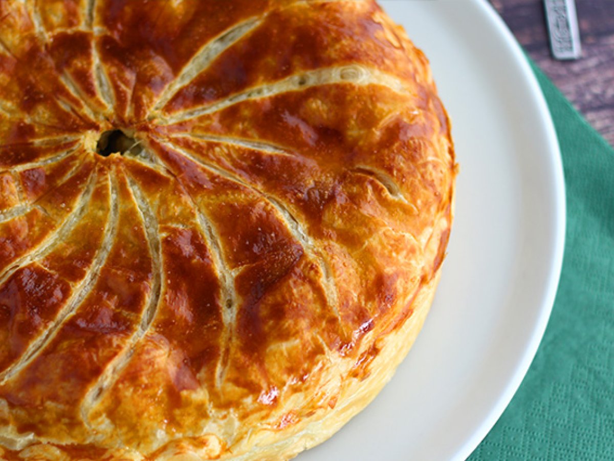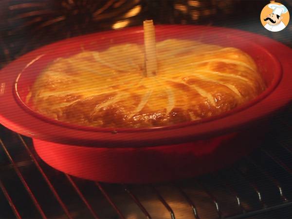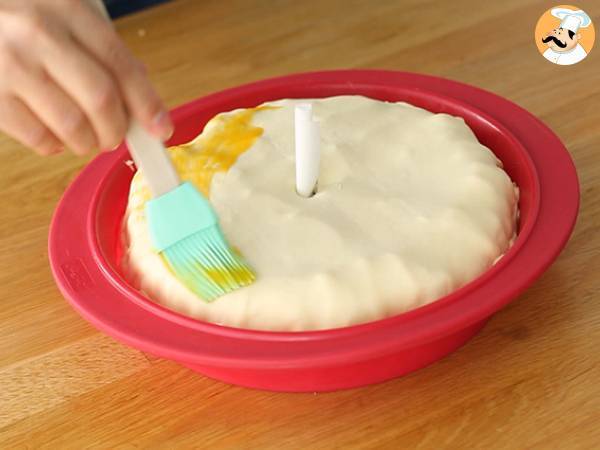 Acoperiti cu un alt aluat de foietaj si introduceti marginile sub primul aluat, pentru a da forma unei placinte. Faceti o gaura in centru si plasati o bucata de hartie de copt rulata pentru a permite aburului sa iasa.