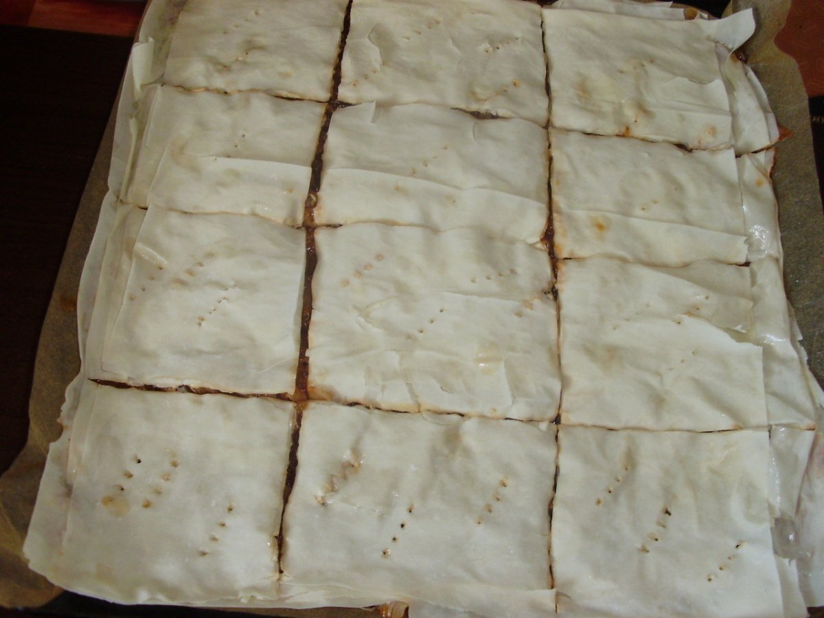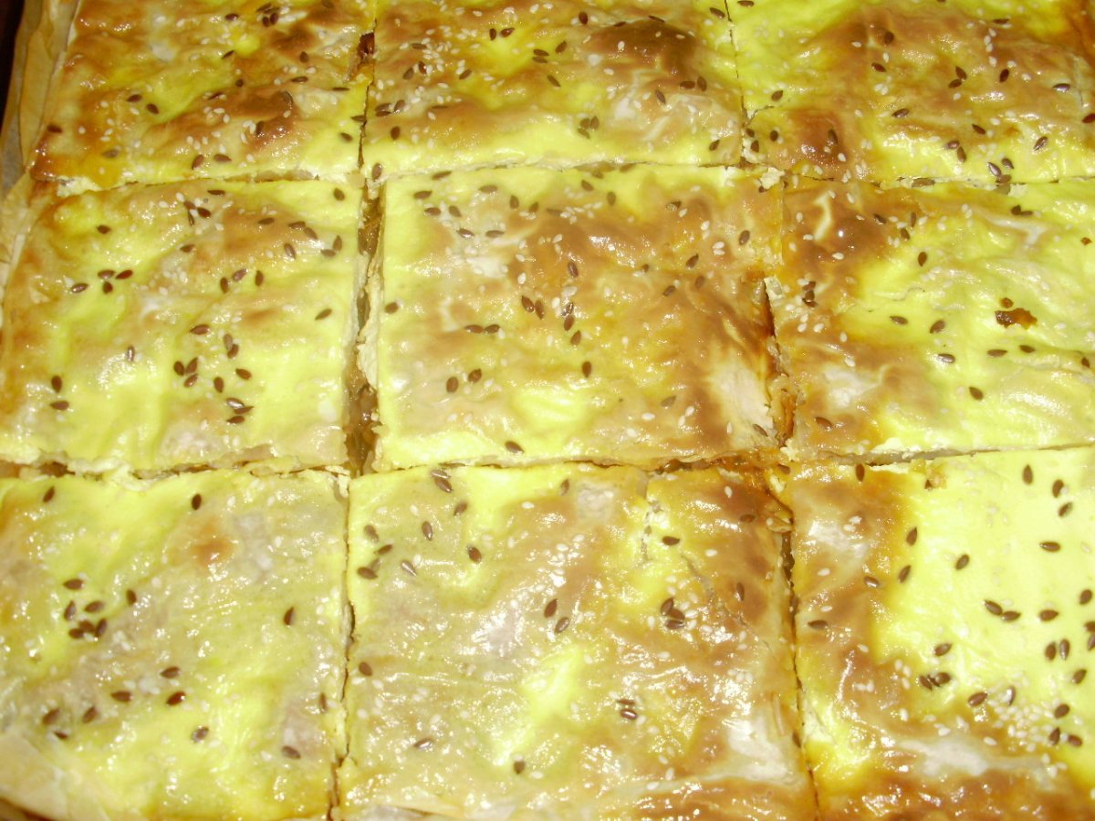 Placinta cu varza PrecedentulUrmătorul Felul principalUșor1 h 20 m Trimite unui prieten Printează pagina Adresează o întrebare autorului Postează o poză cu rețeta gătită de tine Ingrediente 8 1 varza nu foarte mare ( cca 1,3-1,5 kg) 2 cepe medii 2 linguri paste tomate 150 ml ulei 1 pachet foi placinta 1leg marar 2 foi cimbru 1 lingurita piper boabe pentru finisare: 1 pahar mic smantana+2 oua + sare
