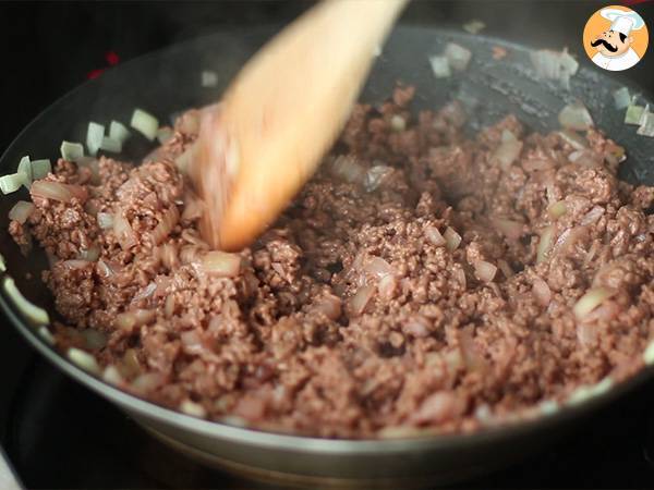 Caliti ceapa intr-o tigaie, apoi adaugati carnea tocata si lasati sa se gateasca.