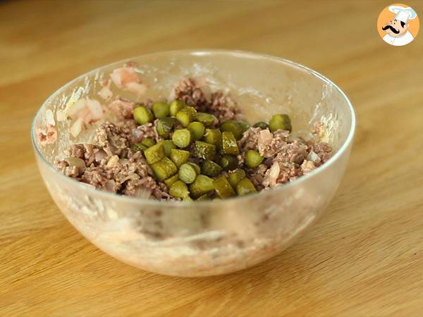 Puneti umplutura intr-un bol+ sare+ piper+ mustar. Amestecati bine, apoi adaugati castravetii taiati in bucati mici.