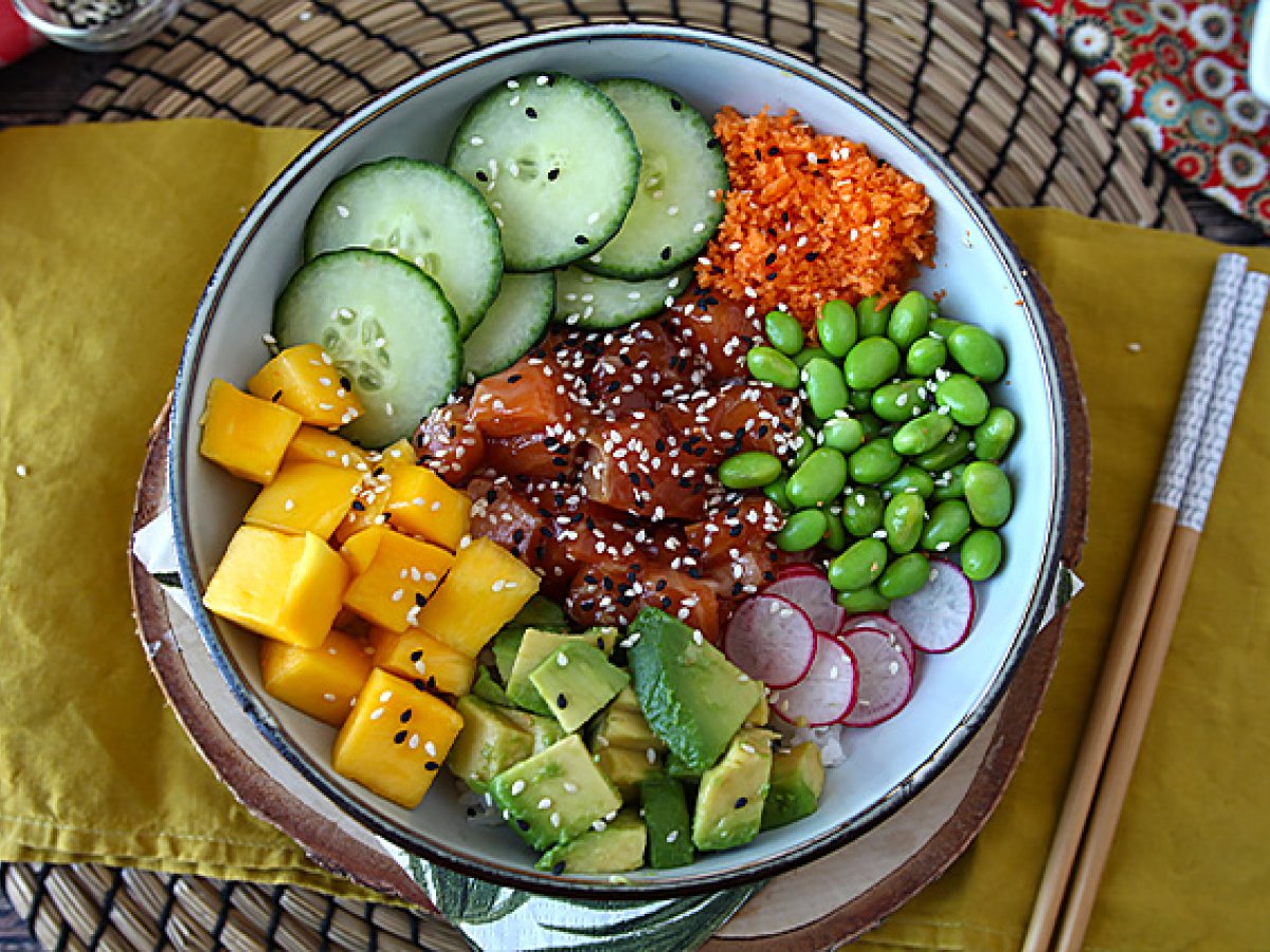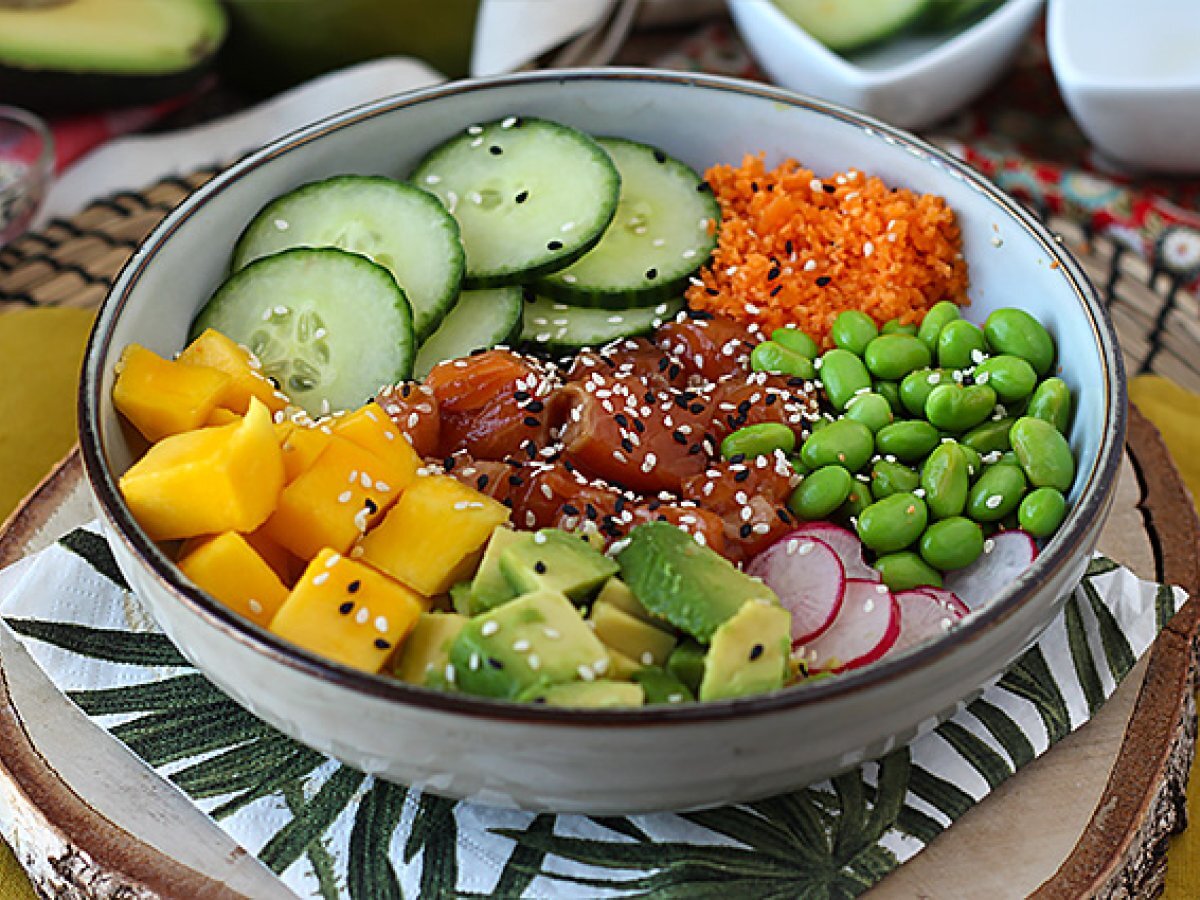 Mergem in Hawaii la pranz ... cu acest bol poké cu somon! Un fel de mancare usor si echilibrat, care iti va infrumuseta ziua ;-) Aici, am decis sa va prezentam o versiune cu somon marinat insotita de bucati de mango pentru un gust exotic si dulce.
