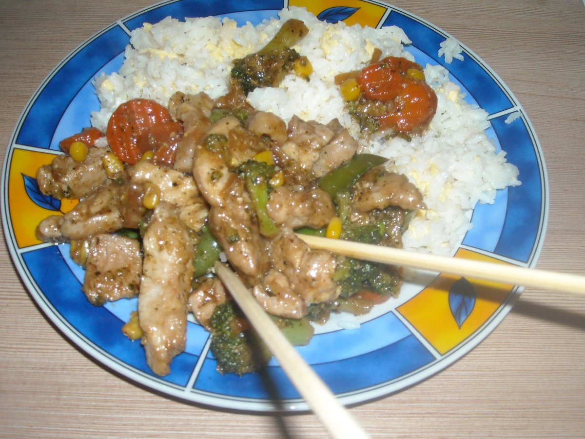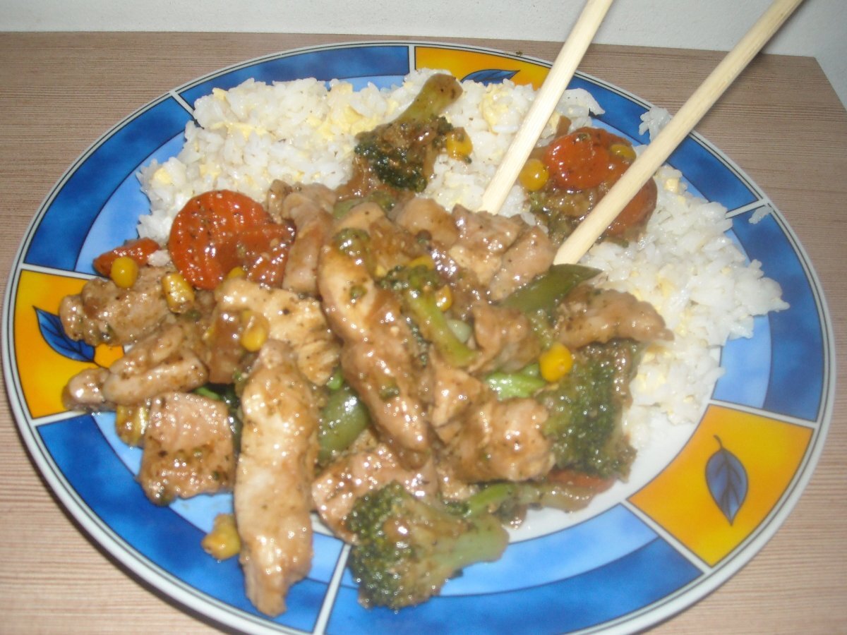 Porc chinezesc si orez cu ou PrecedentulUrmătorul Felul principalFoarte ușor1 oră Trimite unui prieten Printează pagina Adresează o întrebare autorului Postează o poză cu rețeta gătită de tine Ingrediente 2 400 gr carne de porc 1 lingura amidon legume diverse sos de soia sos chili ulei de arahide (sau de masline) 350 gr de orez cu bob lung 2 oua
