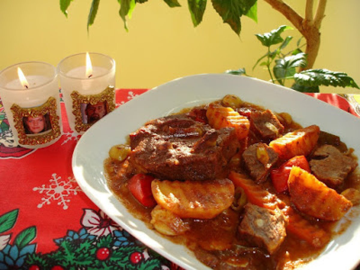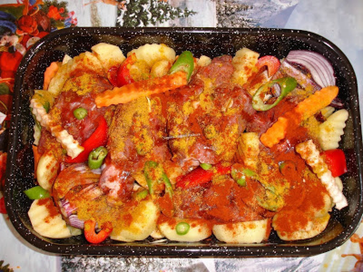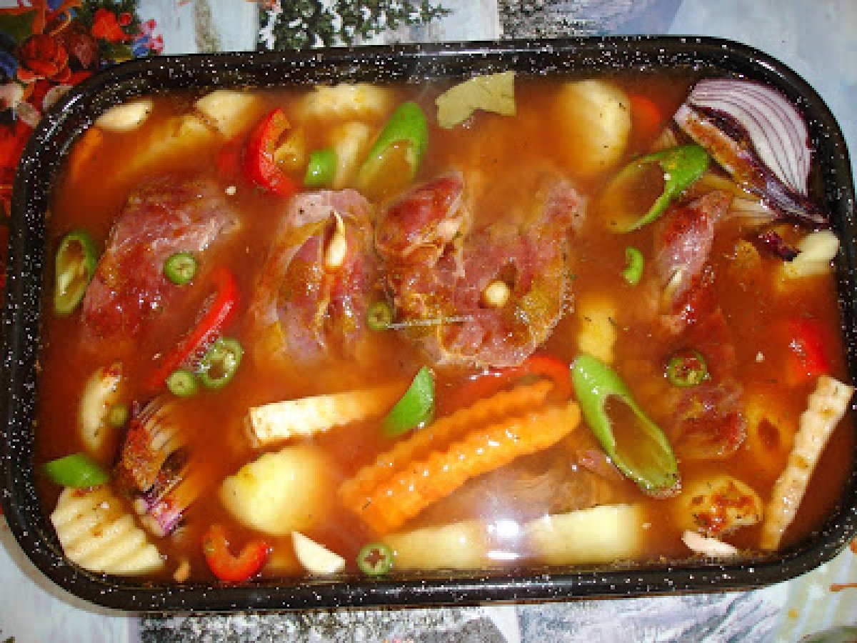 Porc cu legume la cuptor PrecedentulUrmătorul Felul principalFoarte ușor45 min Trimite unui prieten Printează pagina Adresează o întrebare autorului Postează o poză cu rețeta gătită de tine Ingrediente 4 1 ceapa rosie 2 morcovi 1 albitura 1 ardei capia 4 cartofi 1 ardei iute Condimente Cativa catei de suturoi Foi de dafin cimbru