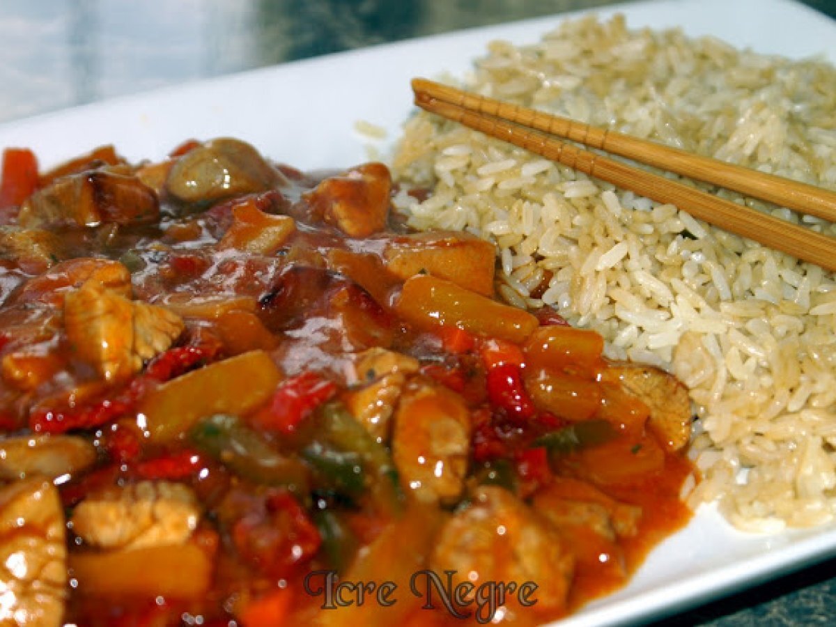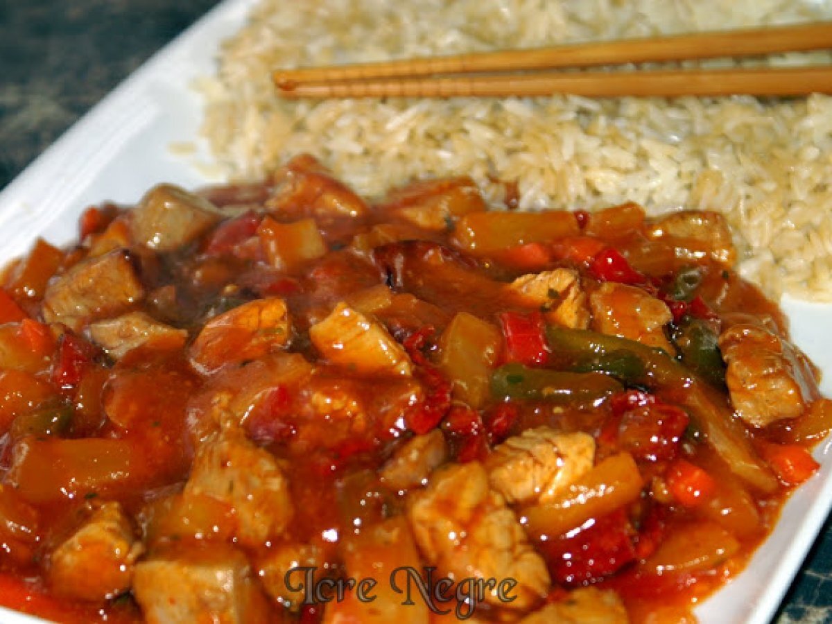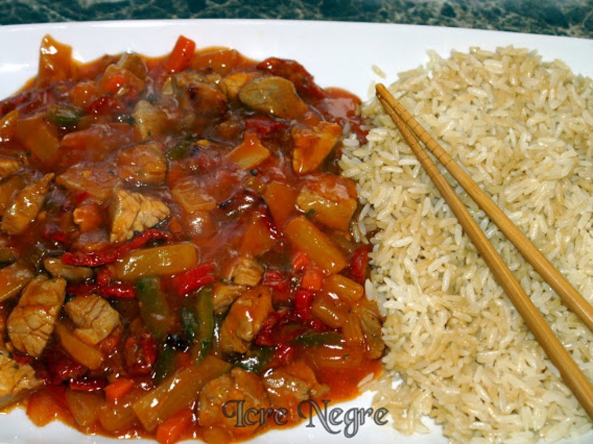 Porc dulce-acrisor PrecedentulUrmătorul Felul principalFoarte ușor50 min Trimite unui prieten Printează pagina Adresează o întrebare autorului Postează o poză cu rețeta gătită de tine Ingrediente 6 600 g carne slaba de porc (muschi), taiata cubulete 5 linguri ulei de arahide sau floarea soarelui 4 catei de usturoi, tocati marunt 3 cm de ghimbir, razuit 1 ardei gras rosu, taiat julien 1 ceapa, feliata 1 morcov mare, taiat julien ½ ardei rosu iute 4 rondele de ananas taiat cubulete 12-15 muguri de bambus 2 lingurite ulei de susan 6 lingurite sos de soia 6 linguri de suc de rosii ¼ lingurita de piper alb, macinat 2 linguri de vin de orez 5 linguri de otet de orez 4 linguri de zahar brun 4 linguri de sos de rosii 1 li, sucul de la orez fiert si ulterior prajit, pentru servit